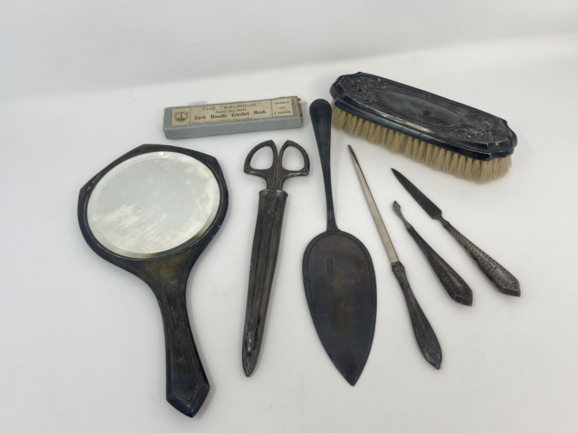 Lot # 45 - Antique Tools & Accessories – Vanity Set, Scissors, Crochet Hooks +