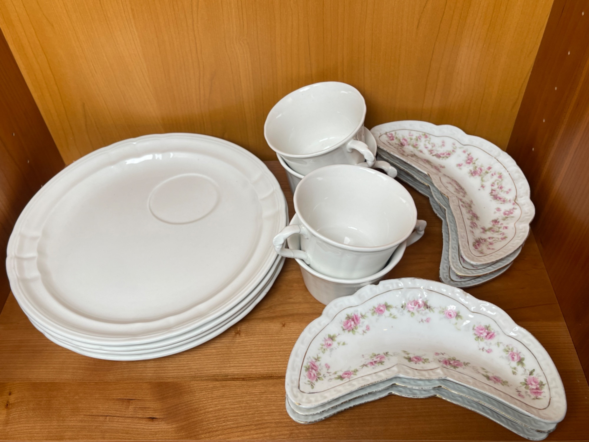 Pontesa Ironstone Tea Set & Orleans Bavaria Bone Dishes This elegant vintage collection includes pieces from the Pontesa Ironstone tea set and Orleans Bavaria bone dishes, offering timeless charm and fine craftsmanship. The Pontesa Ironstone set, made in Spain, features classic white ceramic with embossed details and includes plates, cups, and saucers. Please note that one teacup handle has been glued back together. The Orleans Bavaria bone dishes showcase a delicate floral design with gold trim in a classic crescent shape. With sizes ranging from 4.5” to 9” wide, this set is a wonderful addition to any vintage tableware collection. Some signs of wear are consistent with age—please review photos for condition details. Multiple of them have small chips.