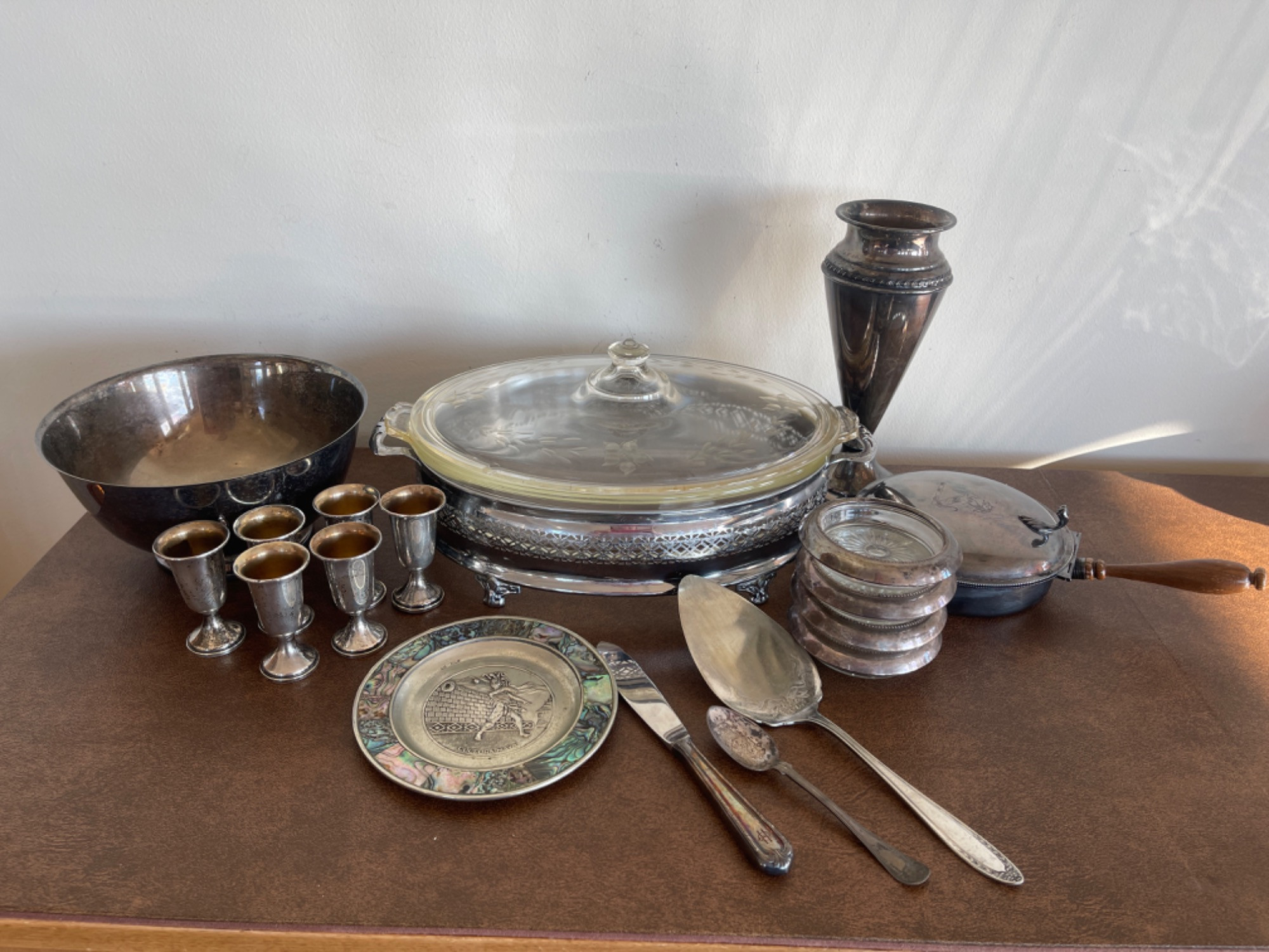 Assorted Vintage Silverplate Lot: Serving Pieces, Flatware & More This assorted vintage silverplate collection features a variety of serving pieces, flatware, goblets, bowls, trays, and decorative items, perfect for collectors and antique enthusiasts. The set includes marked pieces from brands such as Olympic Hotel, L.B., Oneida and I.S. Stainless, adding historical and collectible value. With sizes ranging from 1.5” to 14” wide, these pieces showcase classic silverplate craftsmanship with intricate detailing and elegant designs. Some natural patina and signs of age are present—please review photos for condition details.