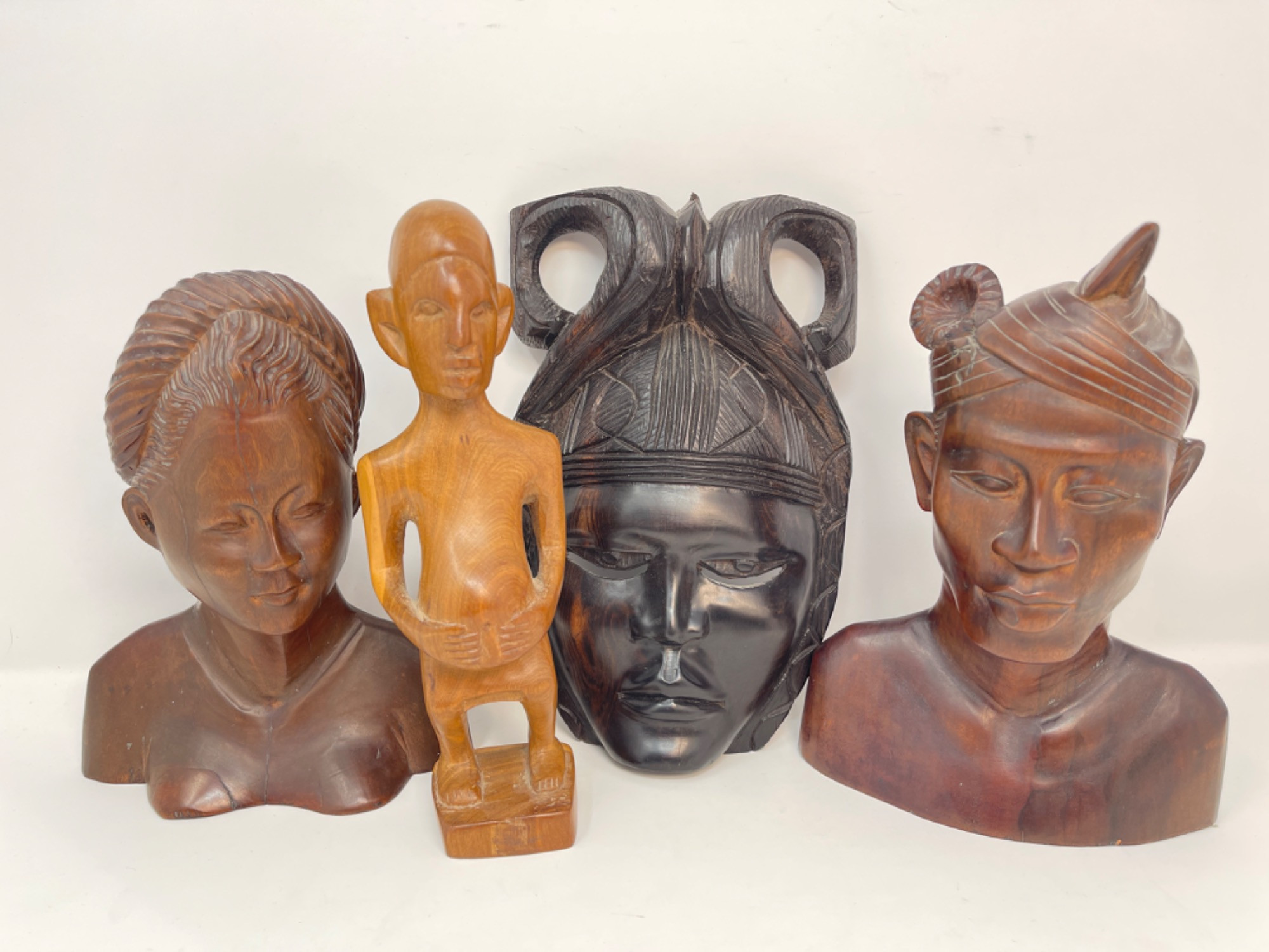 Lot # 84 - Hand-Carved Wooden Figures & Tribal Mask – One Marked "Made in Kenya"