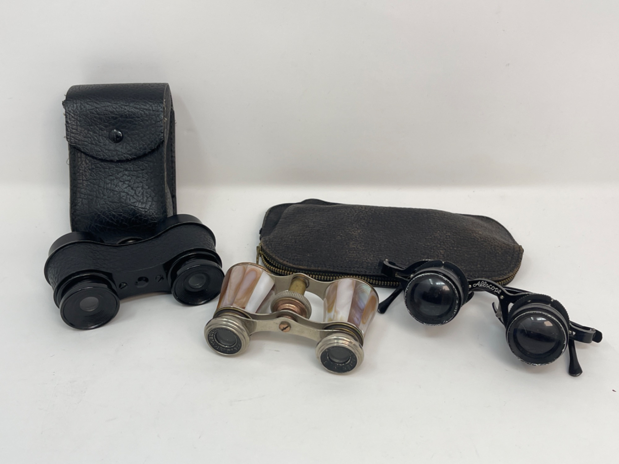 Vintage Eyeglasses & Opera/Theatre Glasses Collection This collection features vintage eyeglasses and theatre glasses, including pieces from Allscope and Wollensak Rochester, USA, both known for their quality optical instruments. The lot includes antique opera glasses, early metal-framed binocular-style glasses, and folding eyeglasses with intricate mechanisms. Some pieces come with their original leather cases, adding to their collectible appeal.