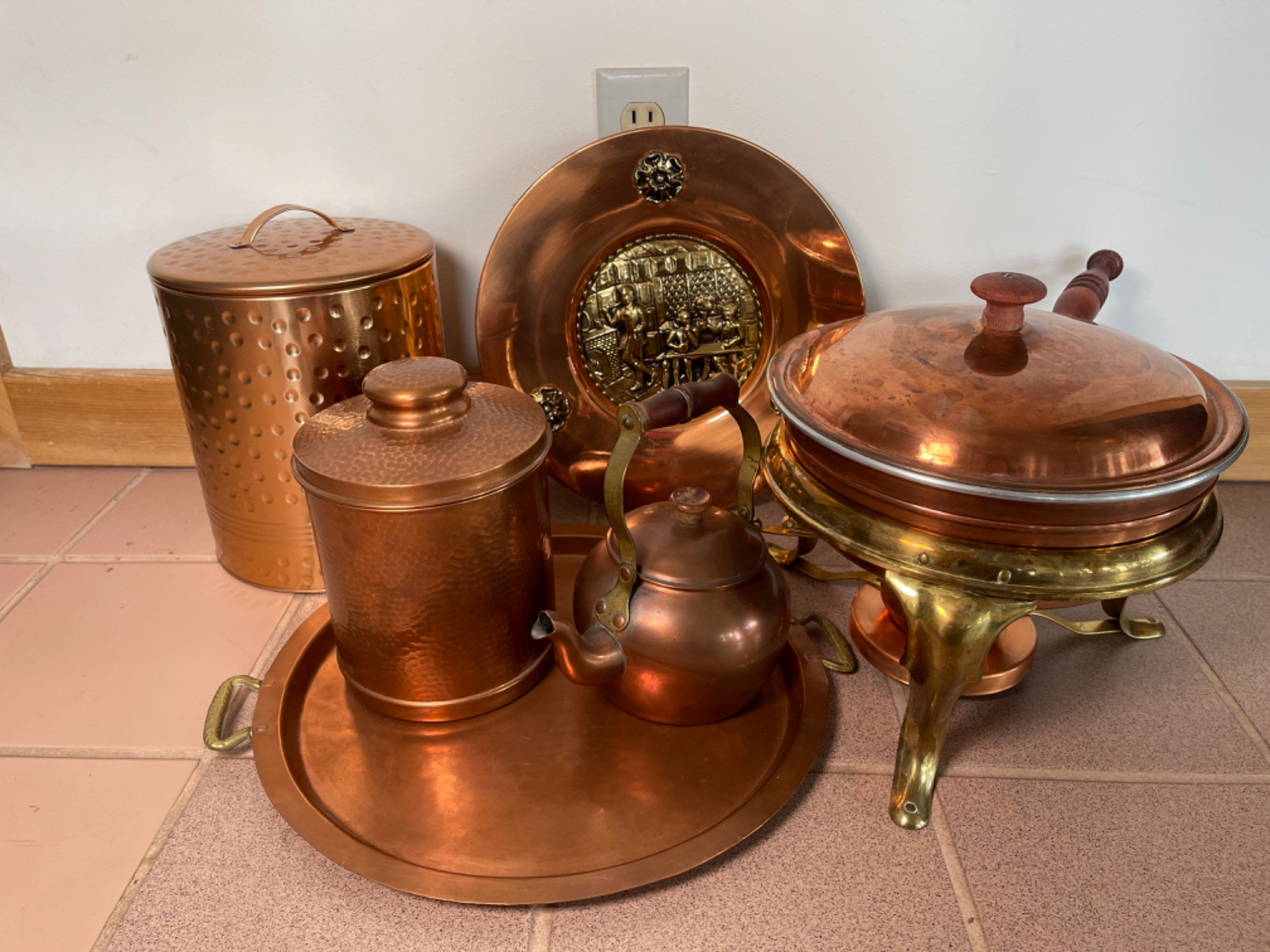 Copper & Copper-Style Assortment – Decorative & Functional Bring a touch of warm, vintage charm to your home with this beautiful collection of copper and copper-style pieces. This diverse set, ranging from 7.5 to 12 inches in height, includes decorative wall plates perfect for adding character to any room, along with functional kettles, cookware, trays, and canisters. Many pieces showcase ornate embossed designs and eye-catching brass accents, highlighting the classic craftsmanship. Whether you're a collector of fine copperware, a decorator looking for statement pieces, or simply someone who appreciates timeless beauty, this collection offers something special.