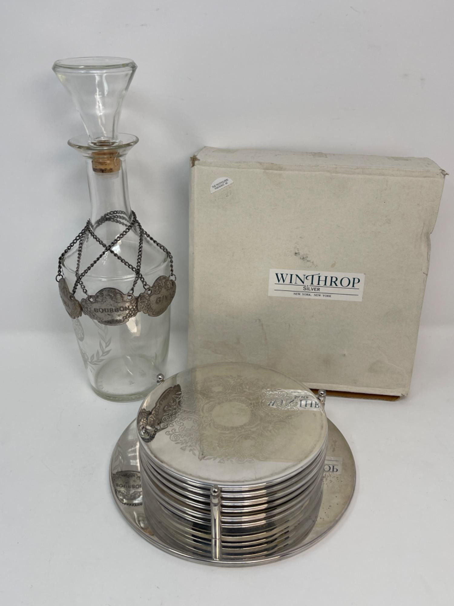 Lot # 98 - Vintage Crystal Decanter w/ Silver-Plated Tags & Tray Set