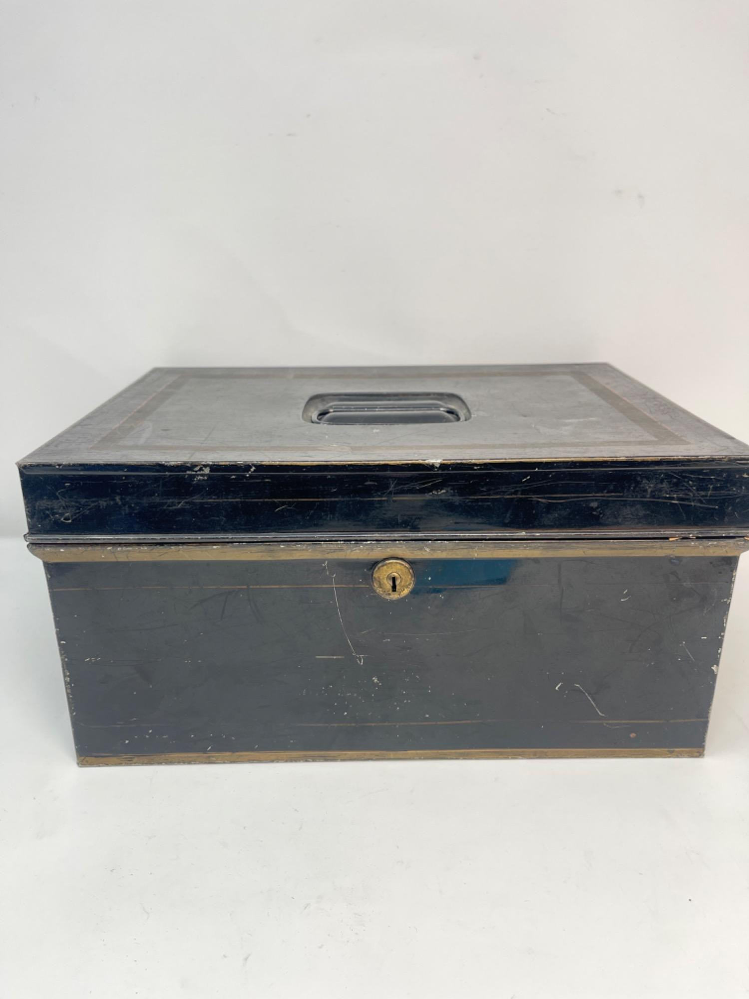 Antique Metal Safety Deposit Box w/ Key – Functional Lock This antique metal safety deposit box features a working lock and original key, making it a secure and collectible storage piece. The box has a sturdy metal construction with a black finish and gold-tone trim, showcasing a classic design. It includes a top handle for easy carrying and a hinged lid for access, with visible signs of use that add to its vintage charm. A unique find for collectors, historical enthusiasts, or those looking for a functional and stylish storage box.
