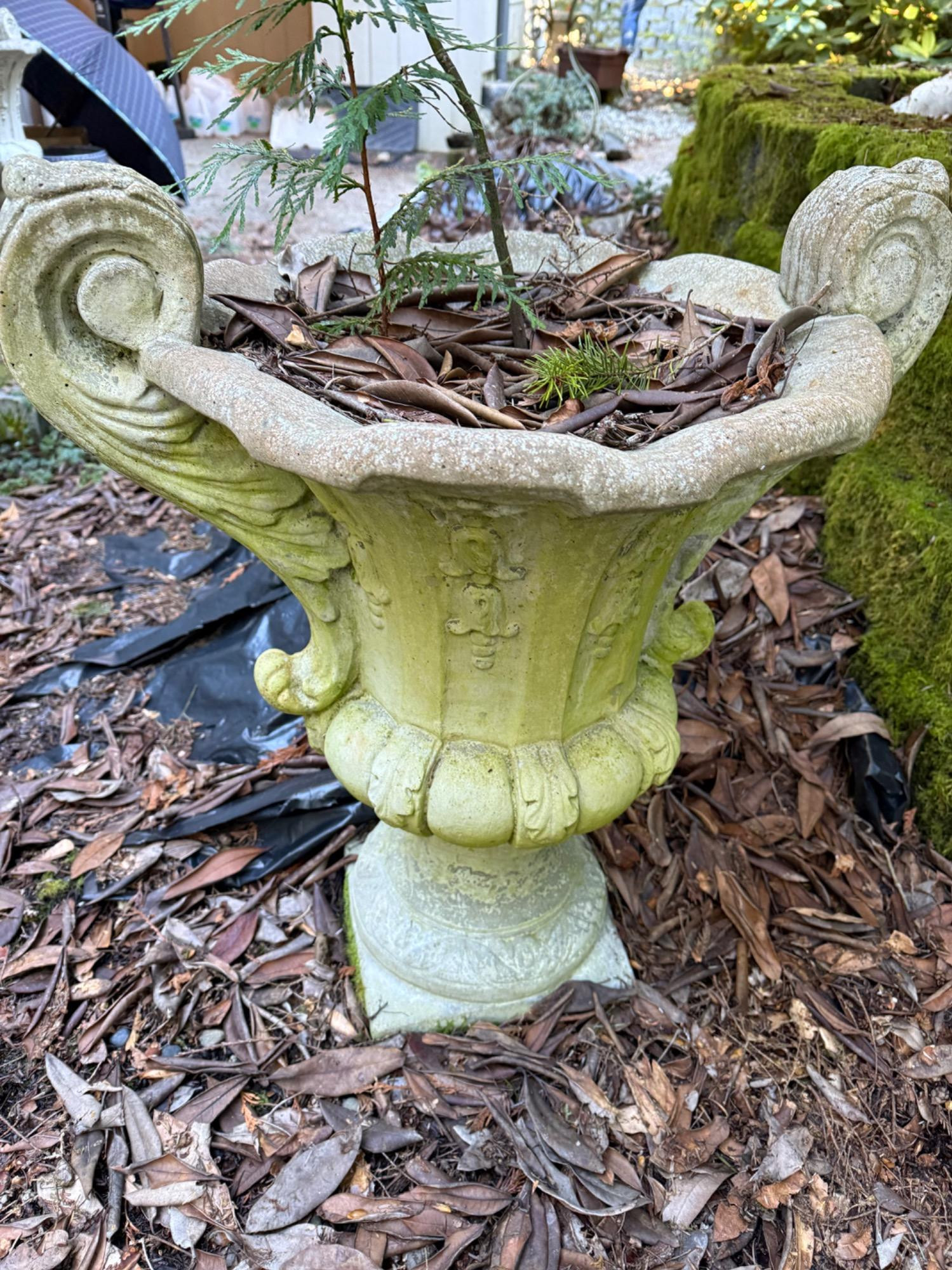 #2 Tuscany Grecian-Style Cement Planter Urn (28H x 24W). This Tuscany Grecian-Style Cement Planter Urn is a beautifully designed ornamental garden piece, perfect for adding an elegant, old-world touch to any patio, entryway, or outdoor space. Inspired by classic Italian and Greek architecture, this planter features intricate sculptural details, curved handles, and a sturdy pedestal base, making it a timeless statement piece. Measuring 28 inches tall and 24 inches wide, this heavy-duty cement urn has a weathered patina with natural moss accents, enhancing its antique European charm. Whether used as a decorative focal point or for showcasing flowers and greenery, this planter is built to withstand outdoor conditions while exuding sophistication and durability. Bidding on this lot is an agreement that: (1.) You will have 2 capable, able-bodied persons to lift and load at a minimum. (2.) You will bring a hand truck and/or any other tools needed to remove this item. If these steps are not followed your item will be forfeited and no refund given.