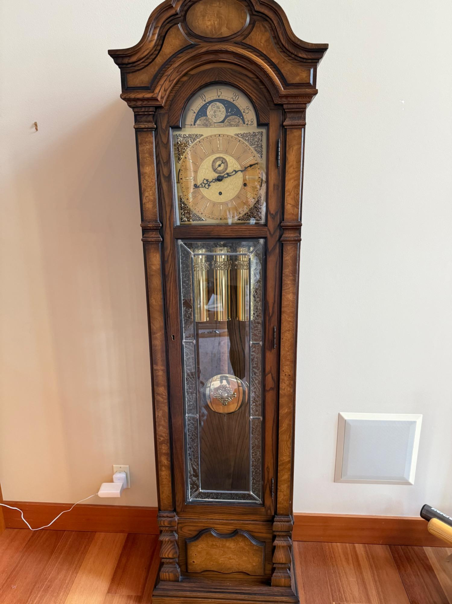 Molyneux Grandfather Clock – Ornate Wood & Glass Case (80.5T x 27.5L x 13W) This Molyneux Grandfather Clock is a beautifully crafted classic timepiece, featuring an ornate wood and glass case with intricate detailing. Standing at 80.5 inches tall, 27.5 inches long, and 13 inches wide, this stately clock is a timeless addition to any home, office, or collection. The clock features a rich wood finish, decorative glass panels, and finely carved accents that showcase its traditional craftsmanship. The brass clock face, pendulum, and chimes add to its elegant aesthetic, making it a striking statement piece. Whether you're a collector of fine clocks or looking to add vintage charm to your space, this Molyneux Grandfather Clock is a must-have heirloom-quality piece. Bidding on this lot is an agreement that: (1.) You will have 2 capable, able-bodied persons to lift and load at a minimum. (2.) You will bring a hand truck and/or any other tools needed to remove this item. If these steps are not followed your item will be forfeited and no refund given.