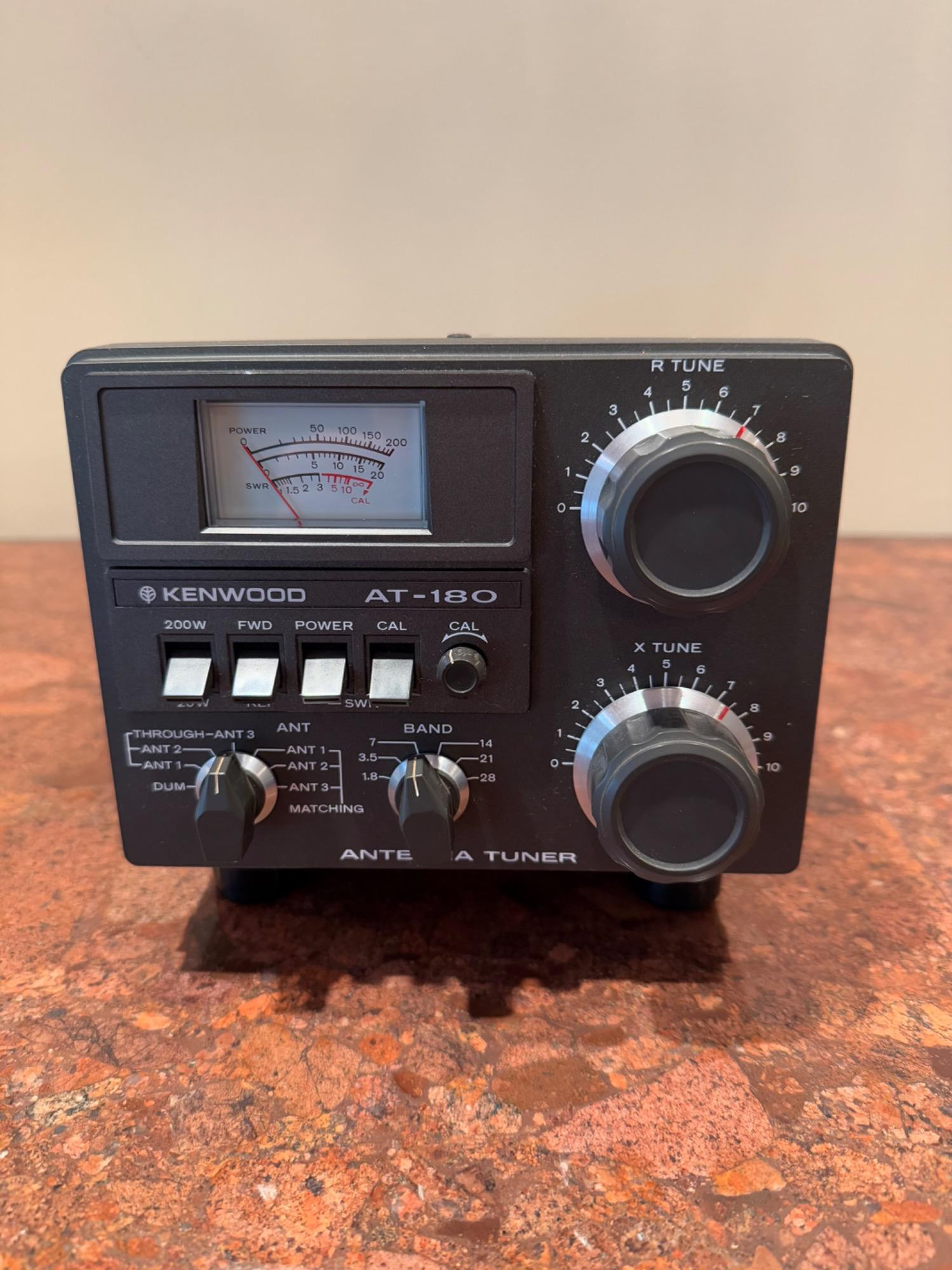 Kenwood AT-180 Antenna Tuner – Includes Original Box. This Kenwood AT-180 Antenna Tuner, manufactured by Trio-Kenwood Corp, is a compact and reliable accessory designed to optimize antenna performance for radio communication enthusiasts. With its classic black metal casing and intuitive control layout, this tuner is a great addition to any ham radio setup. This unit comes with its original box, adding to its value for collectors and Kenwood enthusiasts.