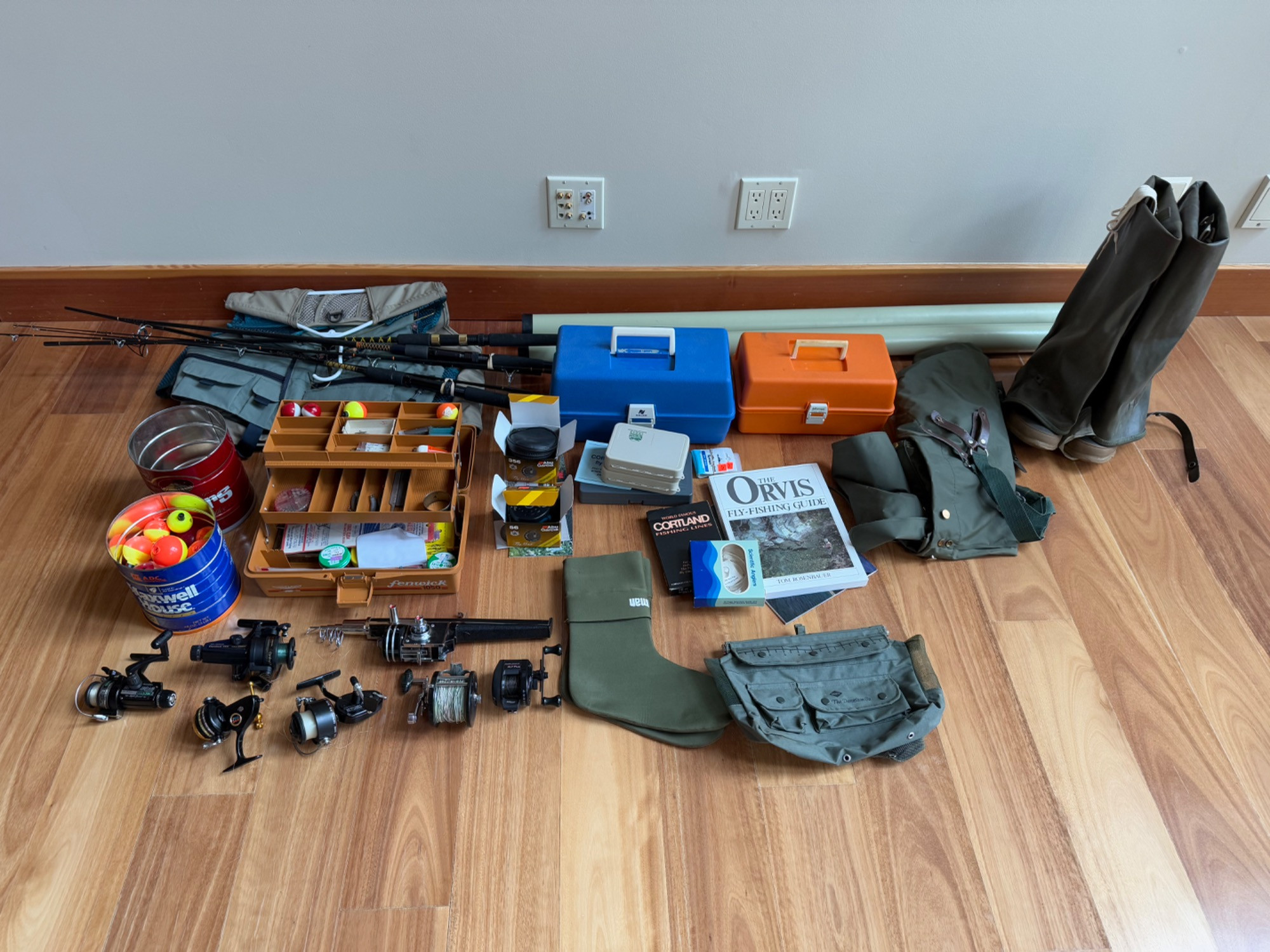 Complete Fishing Gear Lot – Abu Garcia, Daiwa, Fly Fishing Gear & More! This incredible fishing gear lot is packed with value! Includes an Abu Garcia reel, Daiwa Graphite rod, three additional rods, and a compact rod/reel set. Also features fly fishing gear, three vests, tackle boxes filled with hooks, lures, and accessories, plus a selection of fly fishing hooks. Comes with The Orvis Fly-Fishing Guide, waders, and essential gear for any angler. Everything is in great condition—perfect for both beginners and experienced fishermen. Don't miss this chance to upgrade your fishing setup!