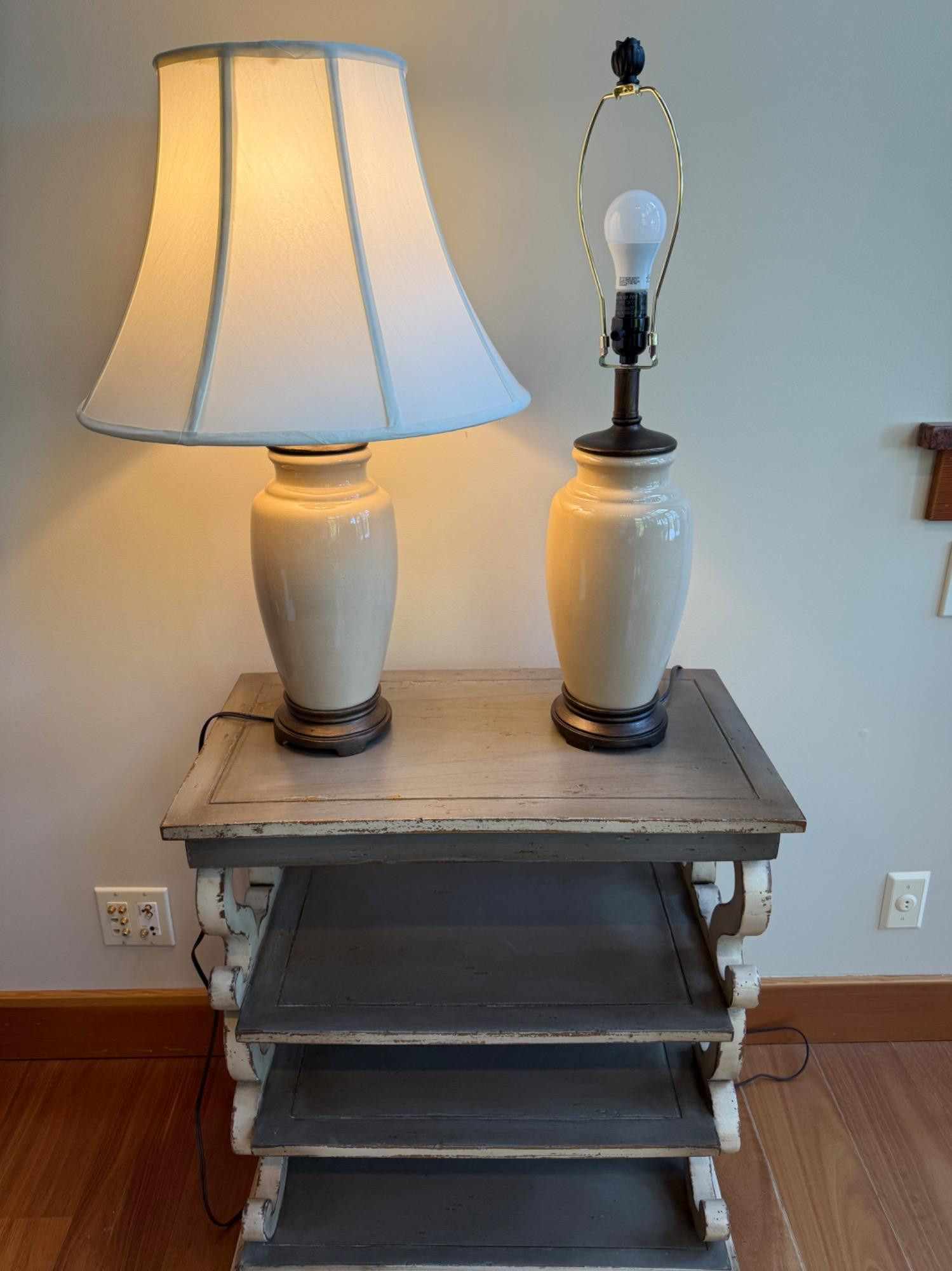 Tuscany Inspired Side Table w/ Scrolled Details + 2 Classic Cream Ceramic Table Lamps. This set beautifully blends the rustic charm of the Tuscany-inspired side table with the classic elegance of the cream table lamps. The distressed finish of the table complements the soft, neutral tones of the lamps, creating a cohesive and inviting look. Place these items together to create a stylish and functional corner in your living room, bedroom, or entryway. Shelf Unit: Sturdy 29.5"H x 26"W x 14.5"D, featuring a distressed finish with elegant scrollwork and three spacious shelves. Lamp Pair: Classic 28"H ceramic base with a neutral cream finish, topped with 17.5"W shades for soft, ambient lighting. Bidding on this lot is an agreement that: (1.) You will have at least 2 capable, able-bodied persons to lift and load at a minimum. (2.) You will bring a hand truck and/or any other tools needed to remove this item. If these steps are not followed your item will be forfeited and no refund given.