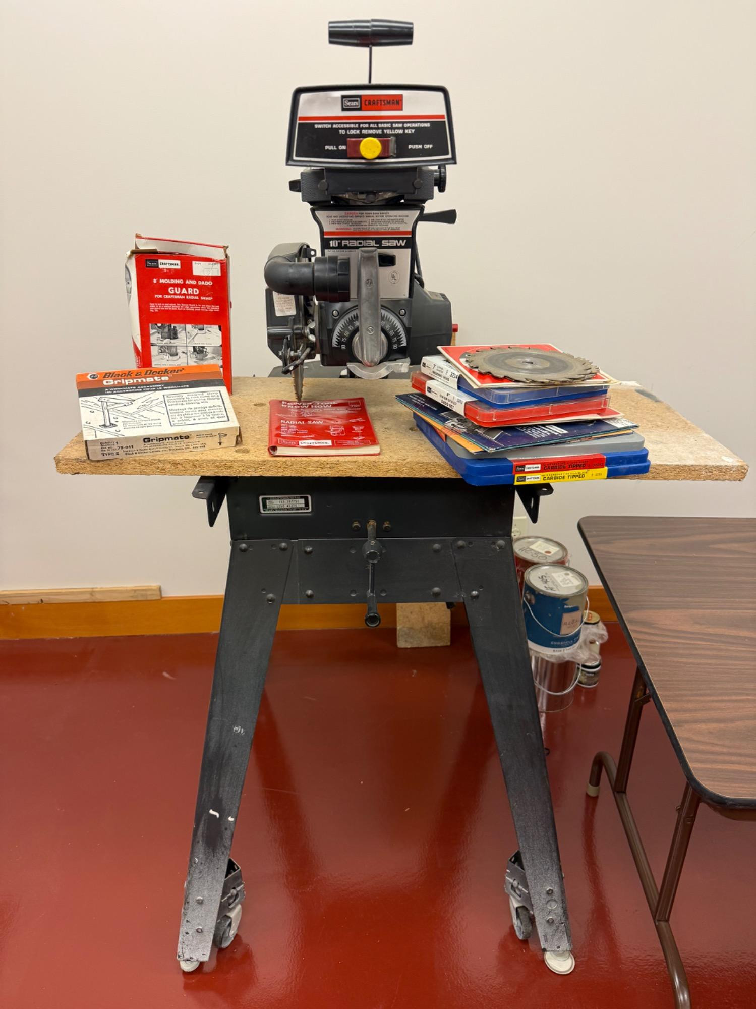 Sears Craftsman 10” Radial Arm Saw with Accessories & Manuals. This Sears Craftsman 10-inch radial arm saw is a powerful and versatile woodworking tool, ideal for making precise cuts on a variety of materials. It includes a sturdy work surface, adjustable arm, and various safety features, making it a great addition to any workshop. The lot also comes with multiple saw blades, accessories, and original manuals, including a Craftsman Power Tool Know-How Book and other reference materials. This ensures you have the guidance and extra tools needed to get the most out of this machine. Note: This item is very heavy—buyers must bring help to load. The 10-inch radial arm saw powers up, but the wood deck is not attached. The lot includes a large bundle of extra blades and dados.