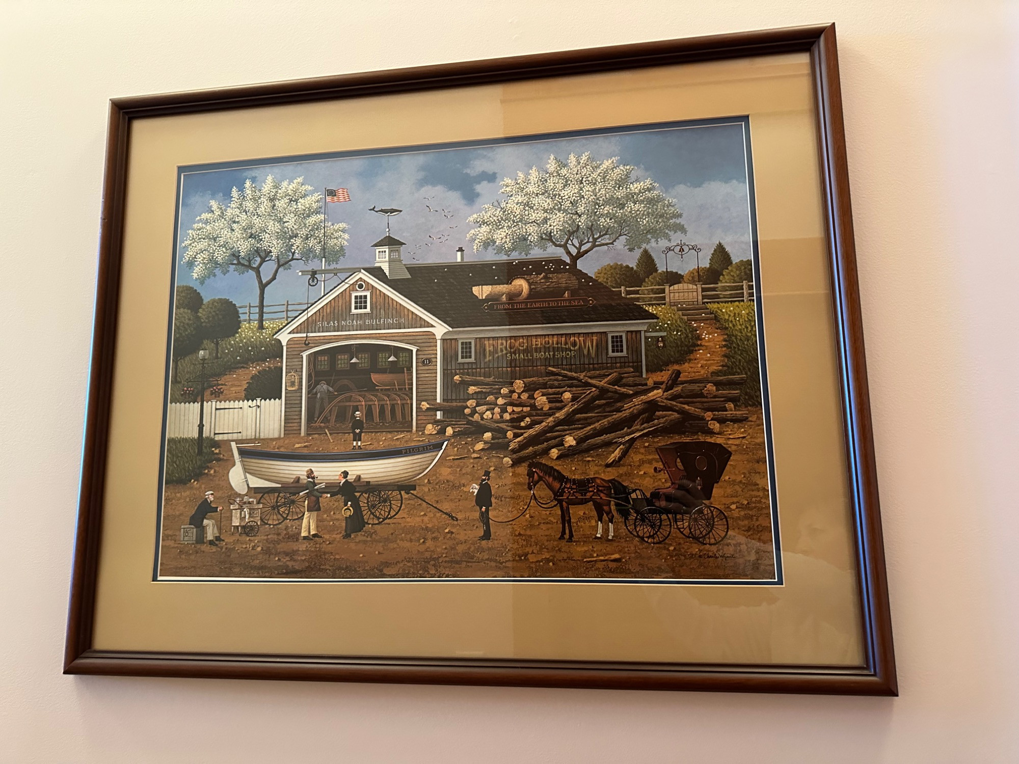 Charles Wysocki Framed Print – "Boat Shop" This Charles Wysocki framed print beautifully captures a nostalgic Americana nautical scene featuring a boat shop, craftsmen, and horse-drawn carriage in a classic folk art style. Measuring 28” x 35”, this piece is framed with a wood-tone frame and matted under glass, ready to display in any home or collection. Wysocki’s artwork is highly regarded for its charming storytelling and detailed folk-style compositions, making this print a wonderful addition for collectors or anyone who appreciates vintage maritime art. Dimensions: 28” x 35” (Framed)