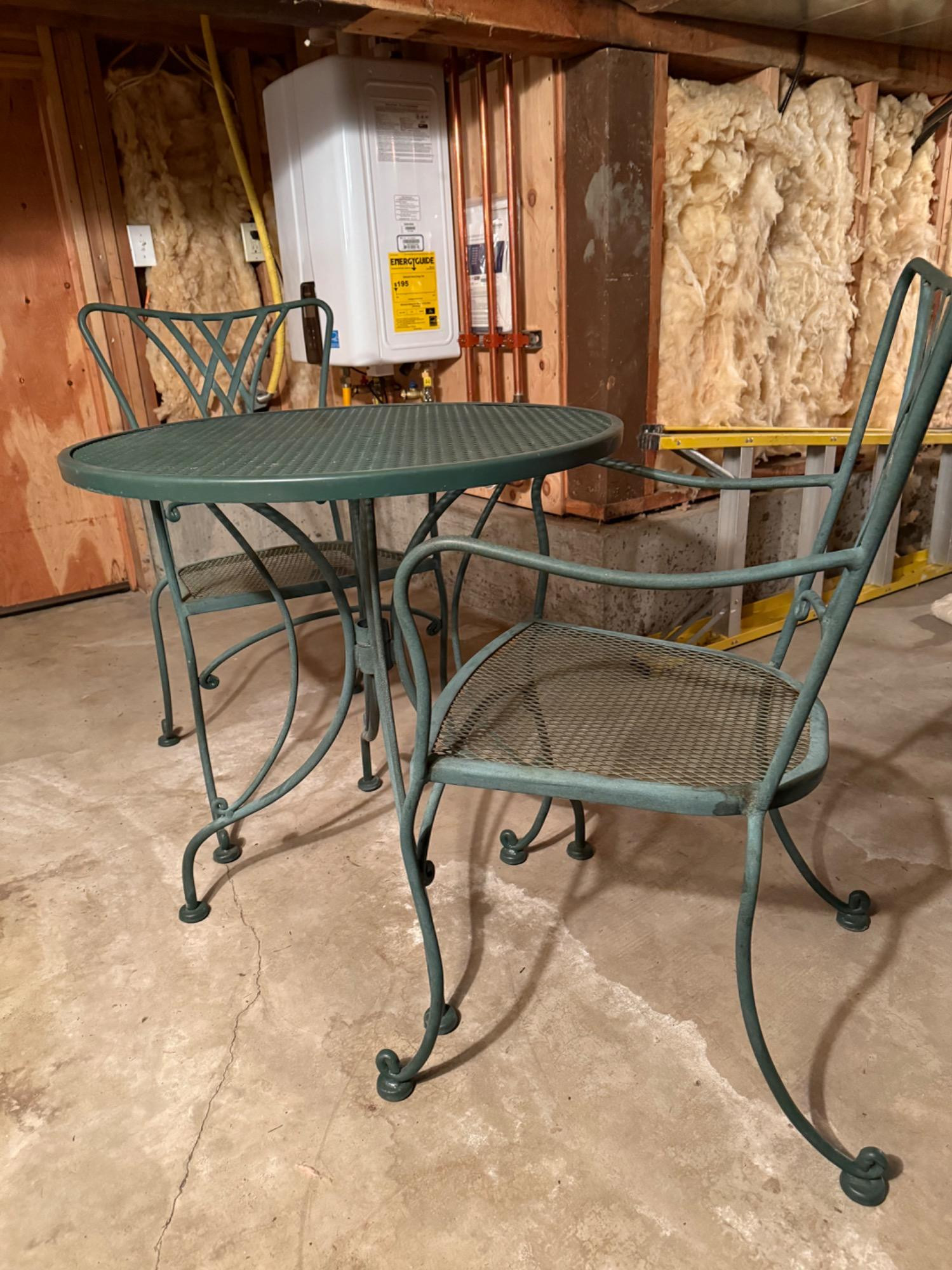Green Finished Outdoor Patio Table w/ 2 Matching Chairs. Stylish and durable green metal patio set, perfect for outdoor lounging or dining. Includes a 28” x 28” round table with an elegant mesh design and two matching chairs measuring 19” W x 21” L x 35” T. Sturdy and weather-resistant, this set brings classic charm to any patio, garden, or balcony. Ideal for relaxing mornings or evening gatherings. Bidding on this lot is an agreement that: (1.) You will have at least 2 capable, able-bodied persons to lift and load at a minimum. (2.) You will bring a hand truck and/or any other tools needed to remove this item. If these steps are not followed your item will be forfeited and no refund given.