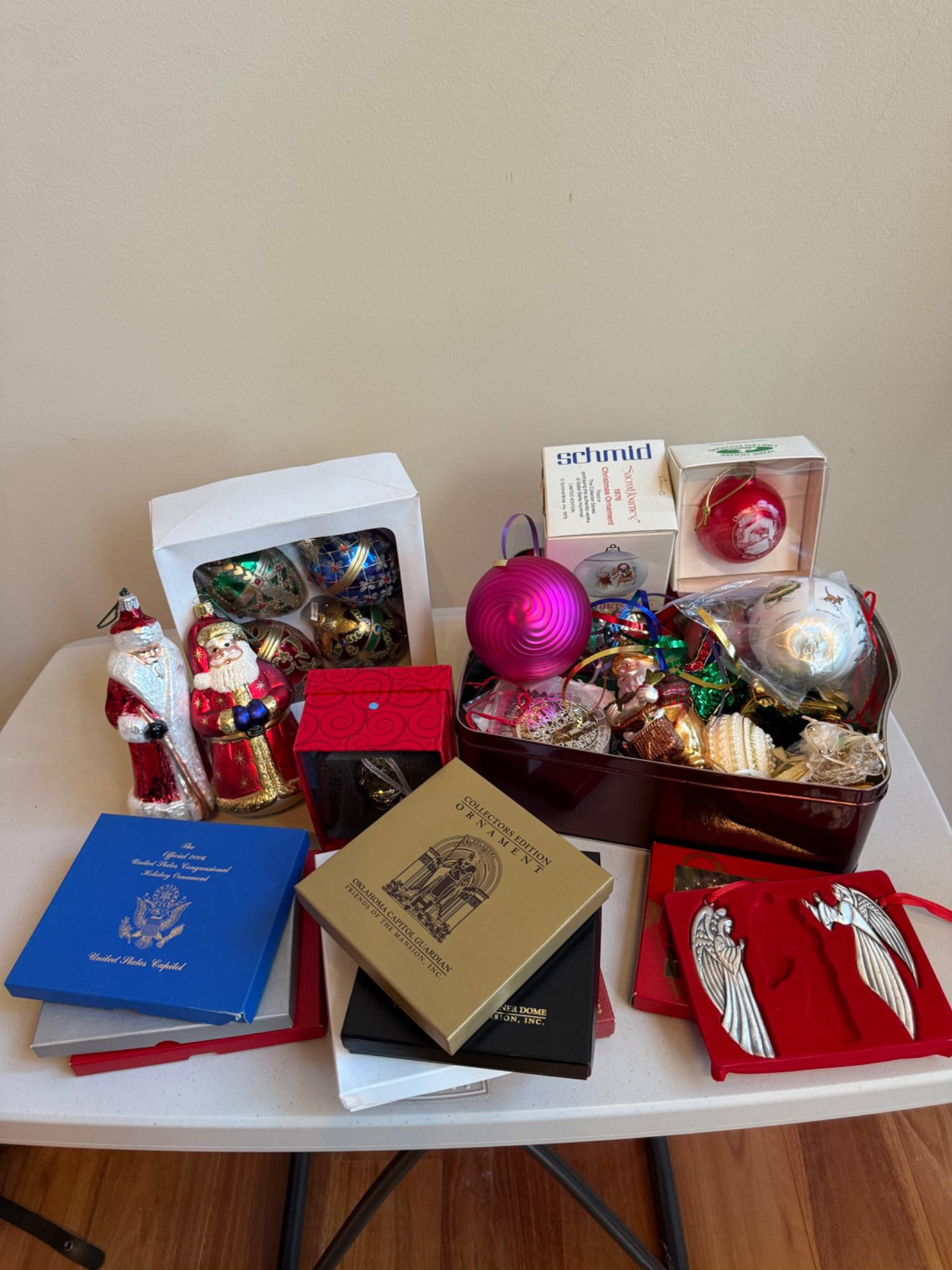 Large Collection of Christmas Ornaments: Boxed, Vintage, Collectibles. This large assortment of Christmas ornaments includes a mix of boxed collectibles, vintage pieces, and unique holiday decorations. Featuring beautiful glass ornaments, angel figurines, hand-crafted stained glass designs, and limited-edition collector’s items, this collection is perfect for enhancing your holiday decor or gifting to a Christmas enthusiast. 🔹 Variety includes: Boxed Schmidt, Capitol, and Collectors' Edition ornaments Hand-blown glass Santa ornaments Vintage 1976 Christmas ball ornament Gold-plated, pewter, and embossed metal ornaments Stained glass Santa, tree, and snowman ornaments Delicate handcrafted and fabric ornaments With many boxed and well-preserved pieces, this set is ideal for both decorating and collecting.