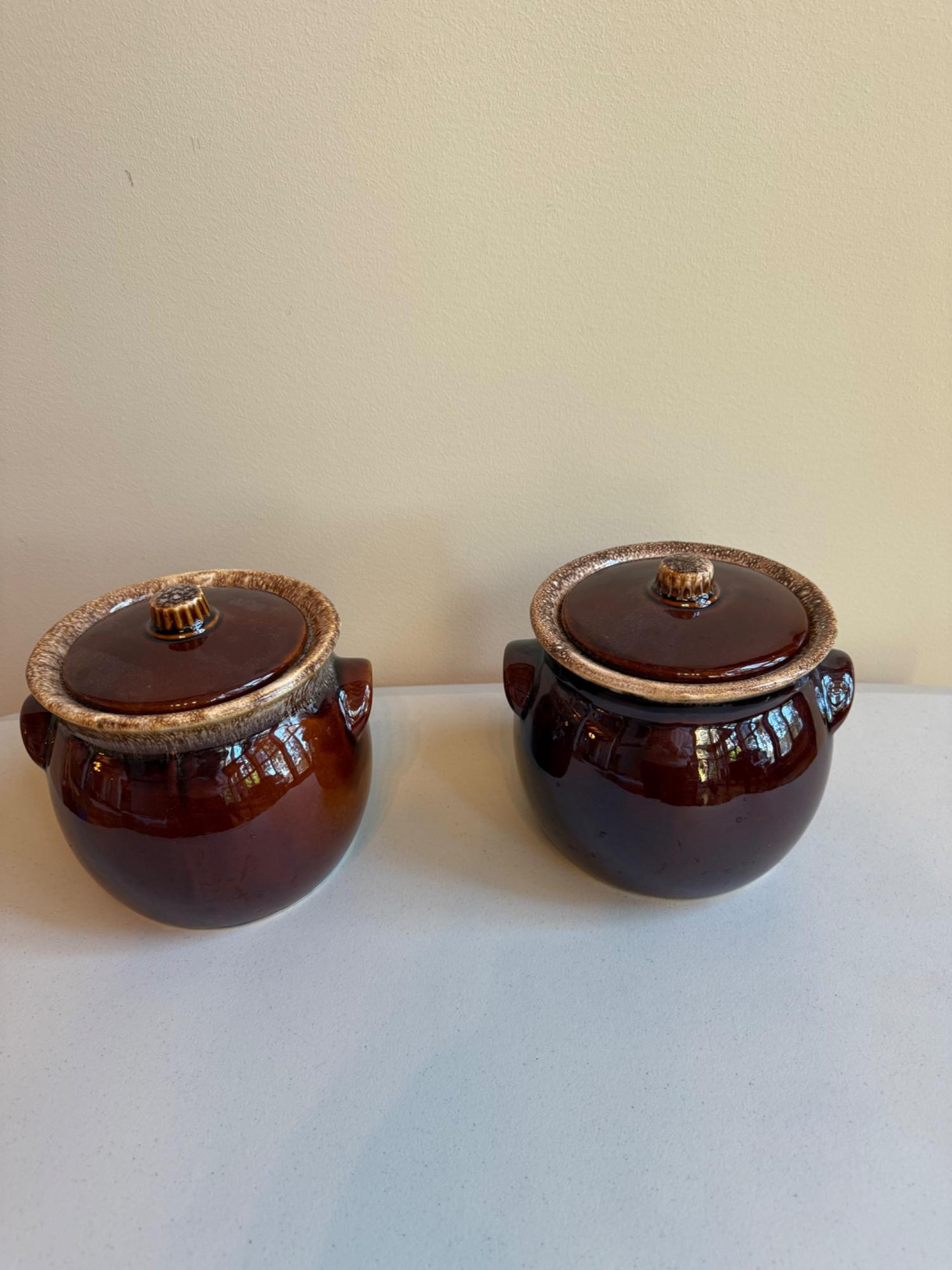 Pair of Vintage Hull Pottery Canisters. Add a touch of rustic charm to your kitchen with this beautiful pair of vintage Hull Pottery canisters. Measuring 7 inches tall and 8 inches wide, these classic brown glazed stoneware canisters feature a warm, rich finish with a speckled rim and matching lids. Perfect for storage or display, they are both functional and collectible, making them ideal for farmhouse or vintage kitchen décor enthusiasts.