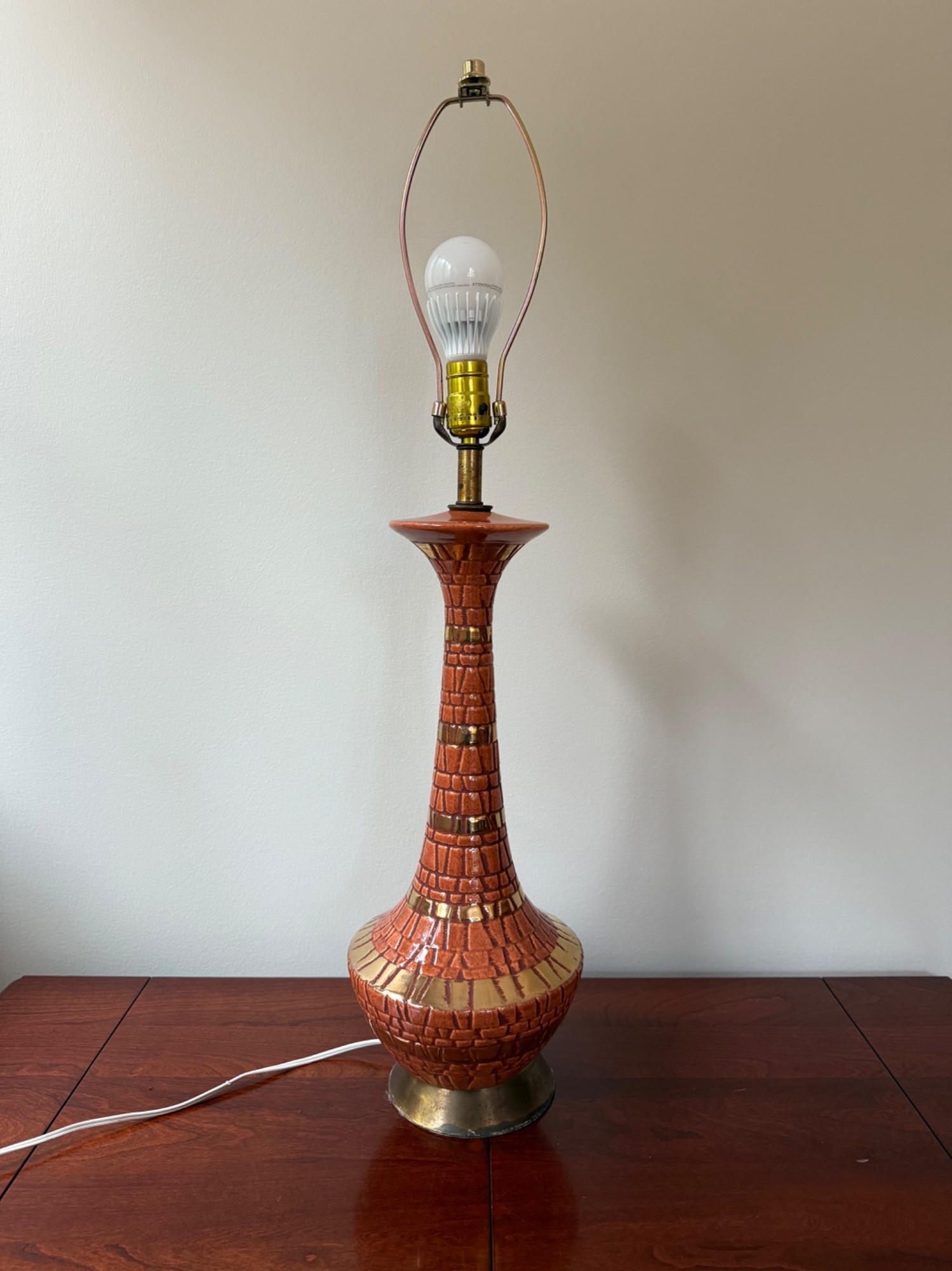 Mid-Century Ceramic Lamp w/ Textured Glaze – Orange & Gold Accents. This beautiful mid-century ceramic lamp features a unique textured glaze design with a warm orange and gold accent finish, adding a bold yet elegant touch to any space. The tall, sculptural form (36” H) and intricate brick-like pattern give it a distinctive retro charm, making it a perfect statement piece for a vintage, eclectic, or modern décor style. 🔹 Dimensions: 36” H A fantastic addition to a living room, bedroom, or office, this lamp combines vintage appeal with timeless sophistication.