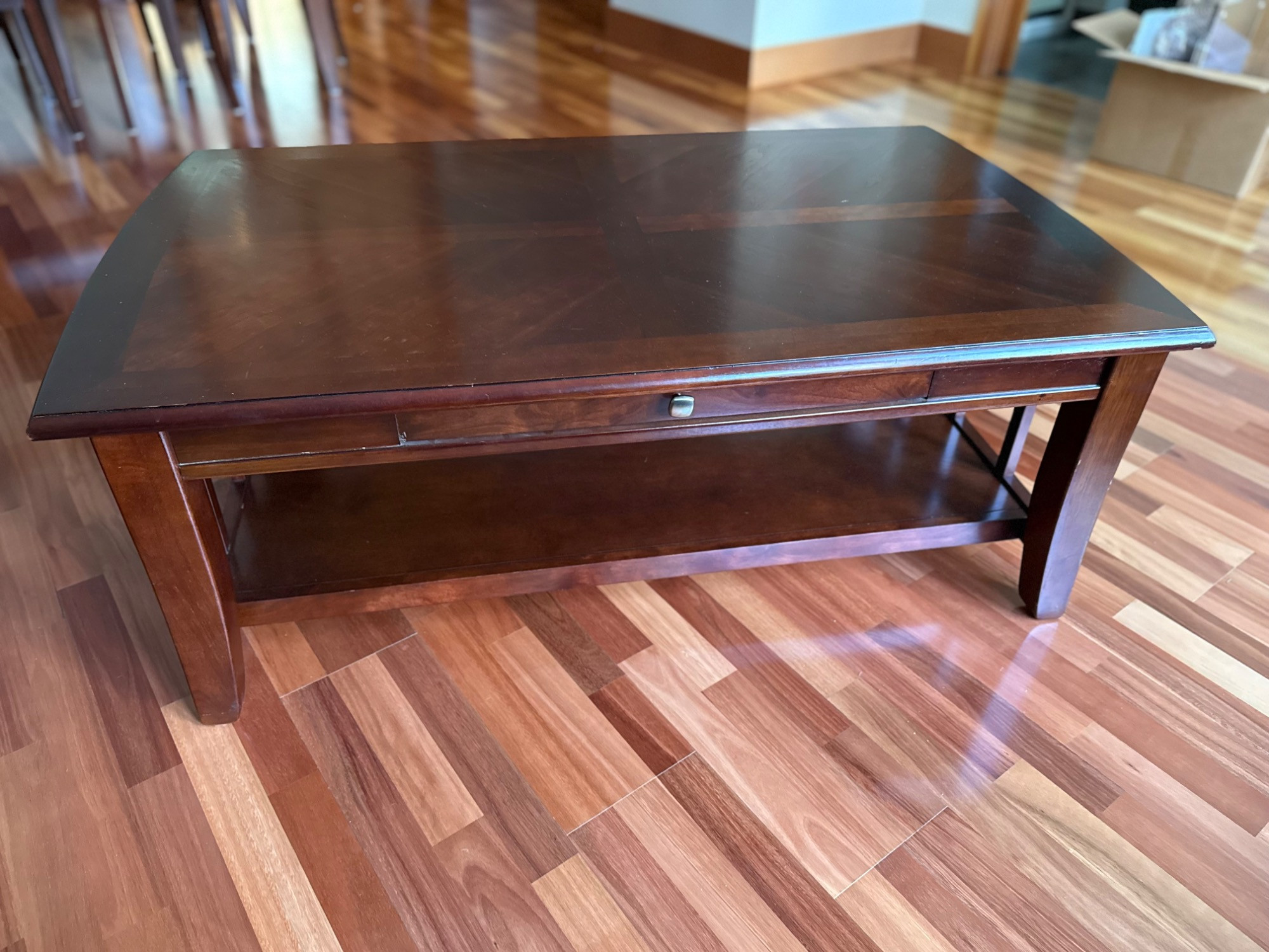 Wood Coffee Table w/ Storage Drawer & Shelf – Elegant Dark Finish. This beautiful wooden coffee table combines classic elegance with functional storage, featuring a rich dark wood finish and a stylish parquet-style inlaid top. The spacious tabletop, built-in storage drawer, and lower shelf make it a practical yet sophisticated centerpiece for any living space. Perfect for traditional, transitional, or modern living spaces, this versatile and sturdy coffee table adds both style and functionality to any home. Bidding on this lot is an agreement that: (1.) You will have at least 2 capable, able-bodied persons to lift and load at a minimum. (2.) You will bring a hand truck and/or any other tools needed to remove this item. If these steps are not followed your item will be forfeited and no refund given.