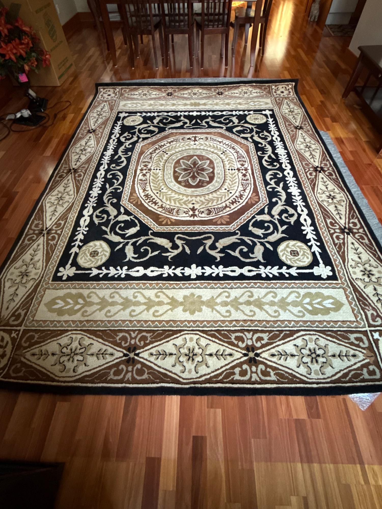 #2 Surya Kashi Hand-Made Wool Area Rug – Made in India. This Surya Kashi hand-made wool area rug, made in India, is a stunning addition to any space, featuring an intricate traditional design with a rich black, brown, and cream color palette. Crafted from 100% wool pile, this rug offers a luxurious texture, durability, and warmth, making it perfect for a living room, dining area, or office. Size: 8' x 11' This high-quality, hand-crafted piece embodies elegance and craftsmanship, with detailed floral and geometric patterns that complement both classic and contemporary interiors.