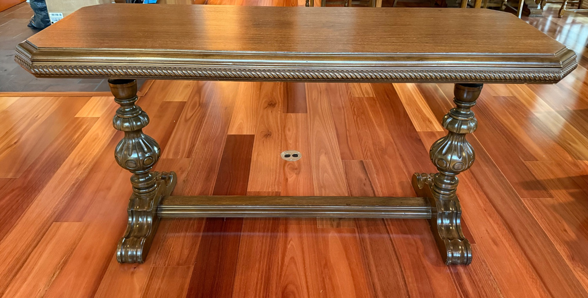 Vintage Library Table w/ Carved Pedestal Base. This elegant vintage library table features a beautifully carved pedestal base with sturdy, turned legs connected by a horizontal stretcher for added support. The spacious rectangular tabletop provides ample surface area, making it perfect for reading, writing, or display. The classic design and fine craftsmanship make this table a versatile piece, ideal for a study, home office, or living space. Bidding on this lot is an agreement that: (1.) You will have at least 2 capable, able-bodied persons to lift and load at a minimum. (2.) You will bring a hand truck and/or any other tools needed to remove this item. If these steps are not followed your item will be forfeited and no refund given.