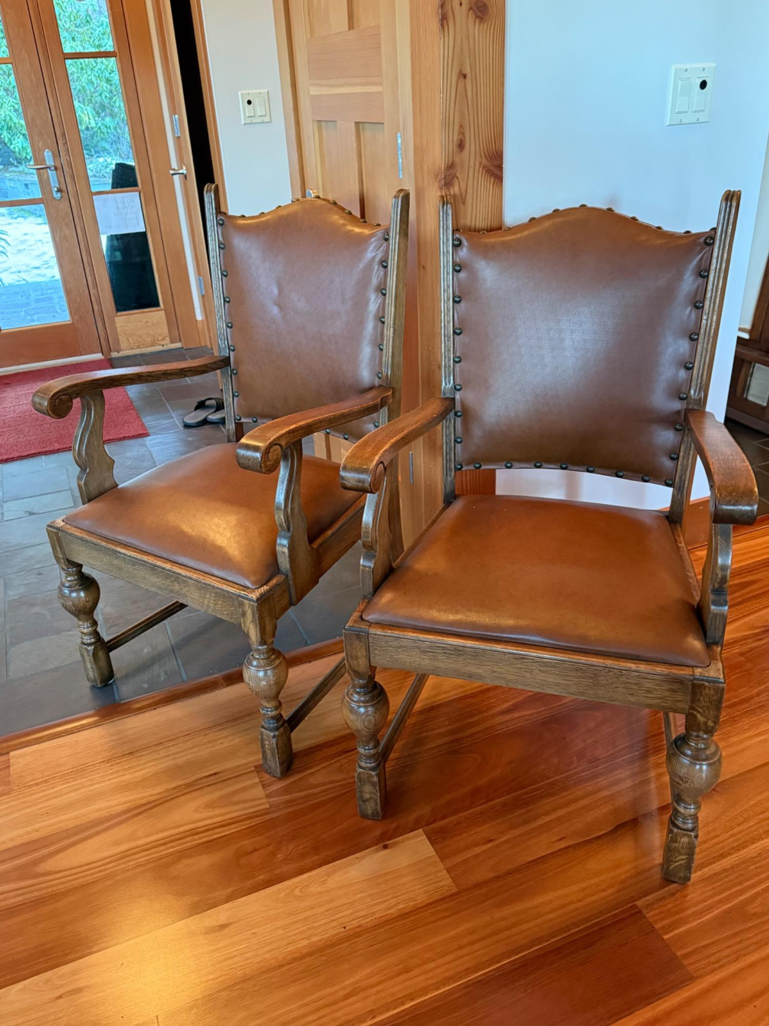 Antique Carved Leather Library Chairs – Nailhead Trim & Turned Legs. This stunning pair of antique library chairs features beautifully carved wooden frames, rich leather upholstery, and elegant nailhead trim accents. The high-back design, scrolled arms, and turned legs add a timeless charm, making these chairs a perfect addition to a study, office, or refined living space. Built for both comfort and sophistication, these chairs showcase classic craftsmanship and enduring quality. Bidding on this lot is an agreement that: (1.) You will have at least 2 capable, able-bodied persons to lift and load at a minimum. (2.) You will bring a hand truck and/or any other tools needed to remove this item. If these steps are not followed your item will be forfeited and no refund given.