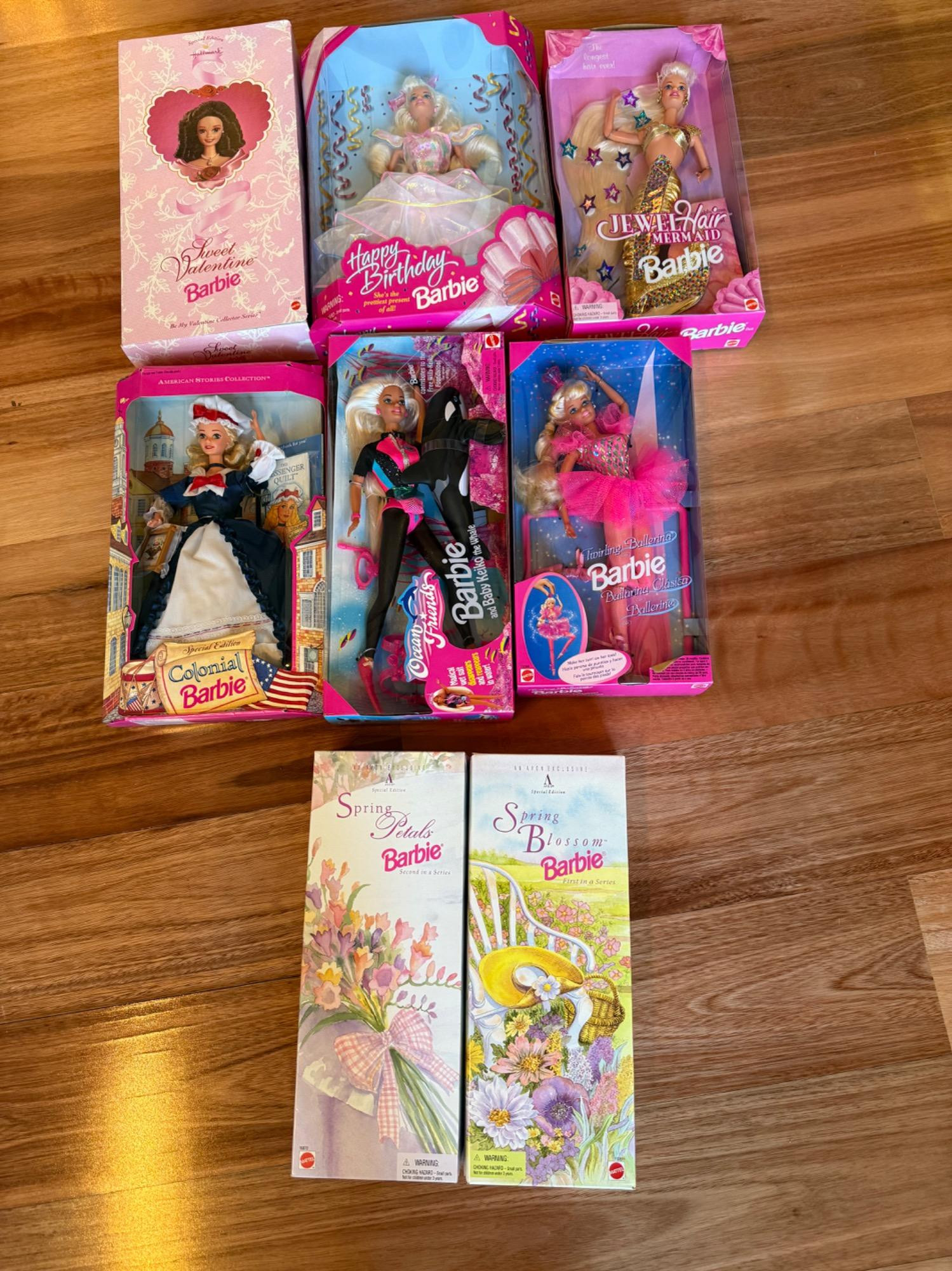 Vintage & Collector Barbie Doll Lot – Various Editions. A wonderful collection of vintage and collectible Barbie dolls, featuring special edition, limited edition, and themed Barbies, perfect for collectors and enthusiasts. Some dolls remain NRFB (Never Removed from Box), while others have been displayed in original packaging.
