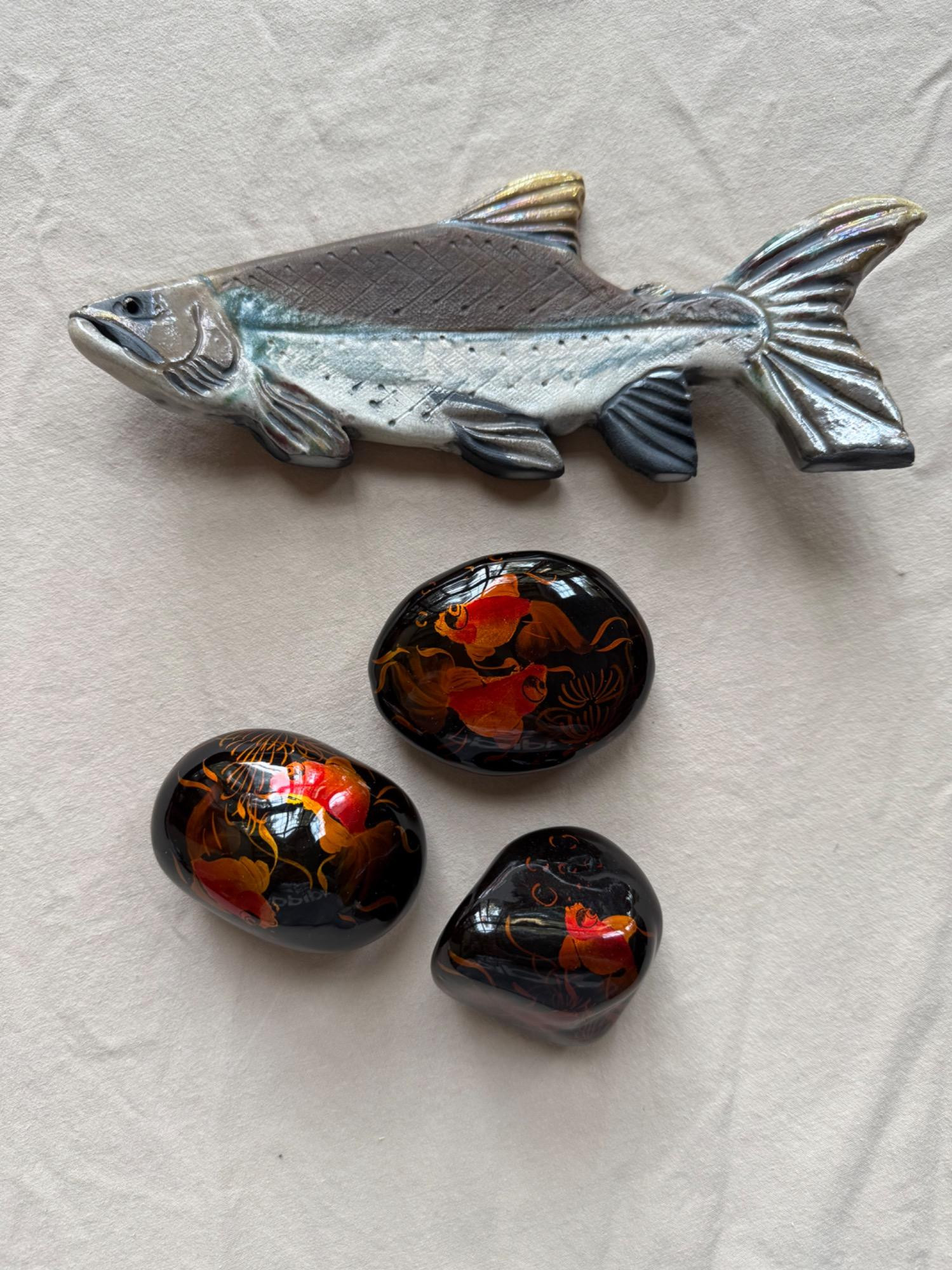 Lot # 182 - Hand-Painted Koi River Rocks & Ceramic Fish Décor – Unique Art Pieces