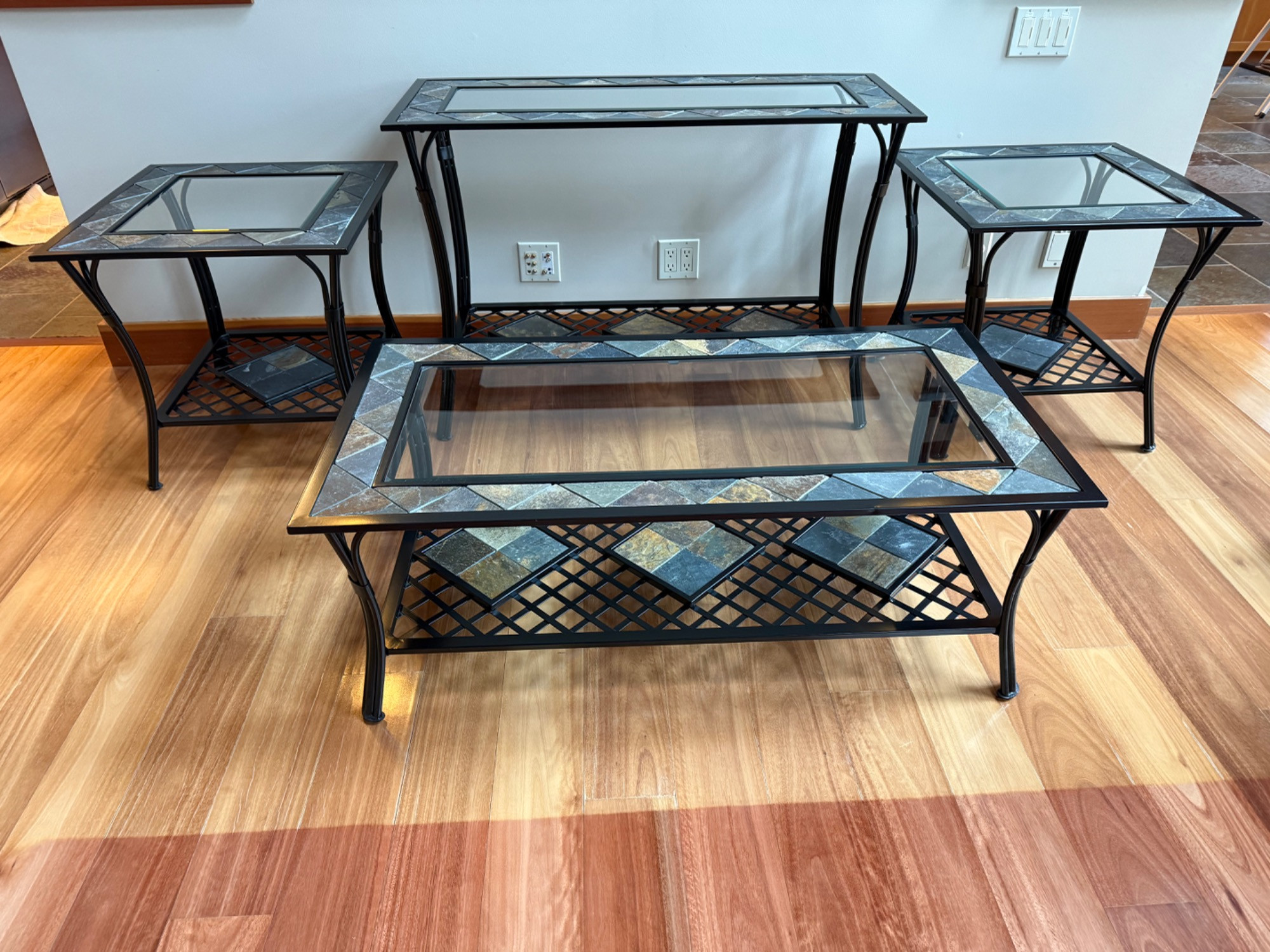 Elegant Slate & Glass Table Set – Coffee Table, Console & 2 End Tables. This stunning 4-piece table set features a sophisticated mix of slate tile inlays, glass surfaces, and a sturdy black metal frame. The set includes: ✔ 1 Coffee Table - 17.5” h x 46”w x 24” d ✔ 1 Console Table ✔ 2 End Tables Each piece showcases a lattice-style lower shelf for added storage and a unique tiled border design for a rustic yet modern appeal. A perfect addition to any living space, blending durability with timeless charm. Bidding on this lot is an agreement that: (1.) You will have at least 2 capable, able-bodied persons to lift and load at a minimum. (2.) You will bring a hand truck and/or any other tools needed to remove this item. If these steps are not followed your item will be forfeited and no refund given.