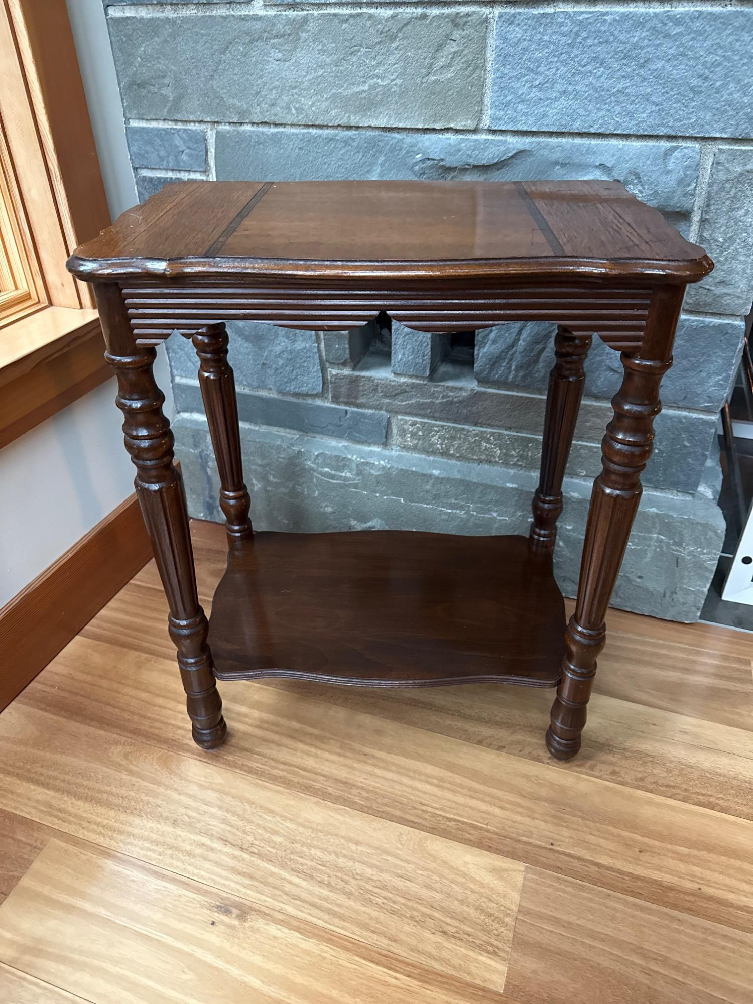 Vintage Wooden Side Table – Turned Legs, Inlaid Top, Elegant Detailing. This beautiful antique wooden side table features elegantly turned legs, a scalloped lower shelf, and an inlaid top with decorative edging. The warm wood tone and classic craftsmanship make it a perfect addition to any vintage or traditional décor. The underside includes handwritten provenance, adding to its historical charm. A timeless accent piece with character and history. Bidding on this lot is an agreement that: (1.) You will have at least 2 capable, able-bodied persons to lift and load at a minimum. (2.) You will bring a hand truck and/or any other tools needed to remove this item. If these steps are not followed your item will be forfeited and no refund given.