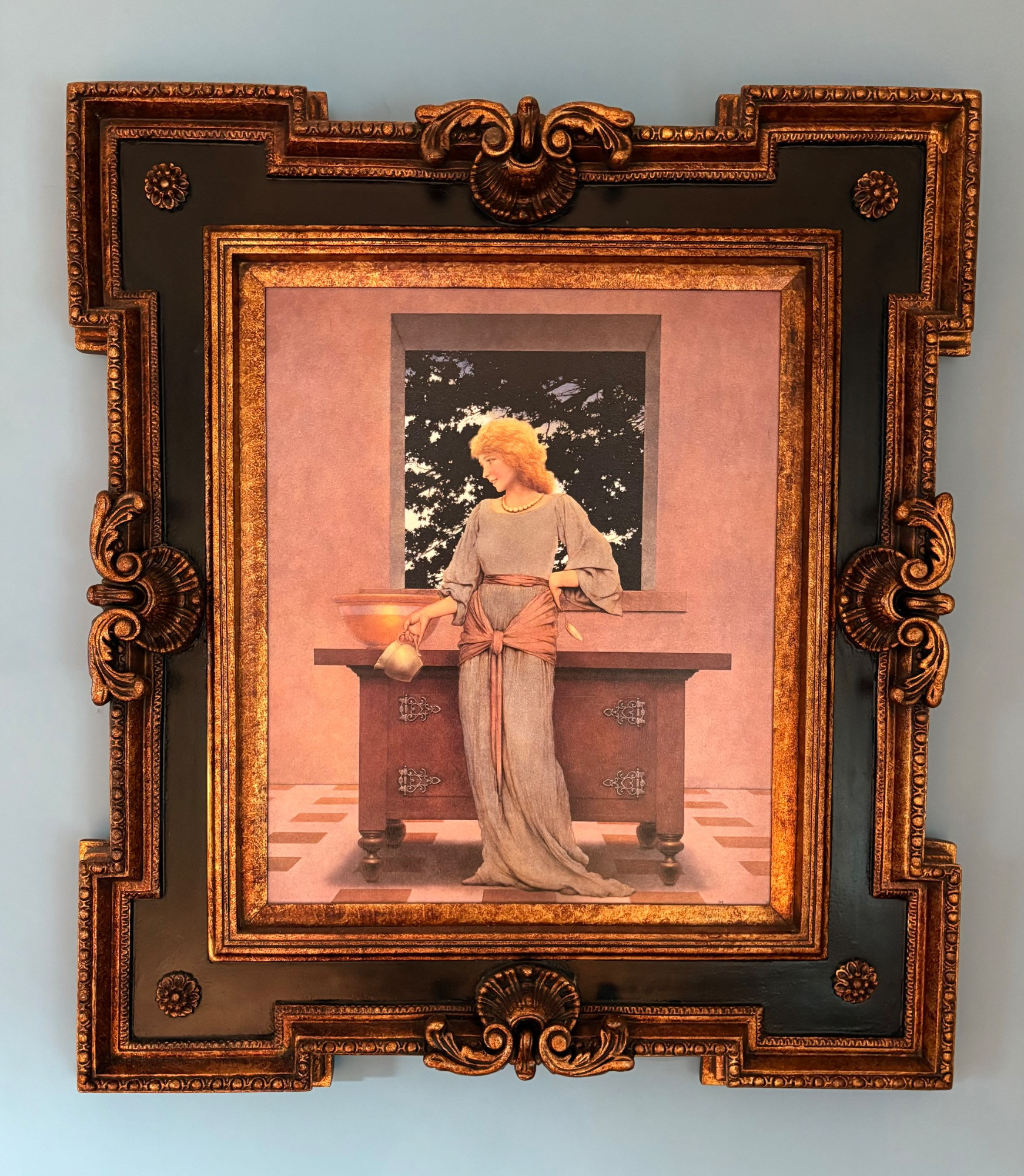 "Knave of Hearts - Lady Violetta About to Make Tarts" by Maxwell Parrish (1870 - 1966).. This reproduction painting on canvas has rich warm pinkish paint tones and a uniquely shaped wood frame. Fairly large piece - a little over 3' high framed. From Around the Corner Fine Art of Virginia known for producing high quality reproductions & frames in the 1980s & 1990s (Sadly, they appear to have closed shop in the early 2000s). We found a catalogue offering many of the exact works our client owned that roughly aligns with our client's purchase dates (pre-internet when everything was phone ordered or mail ordered). For those curious about the original price range/production of the paintings, see catalogue info in photos below after the listing photos.