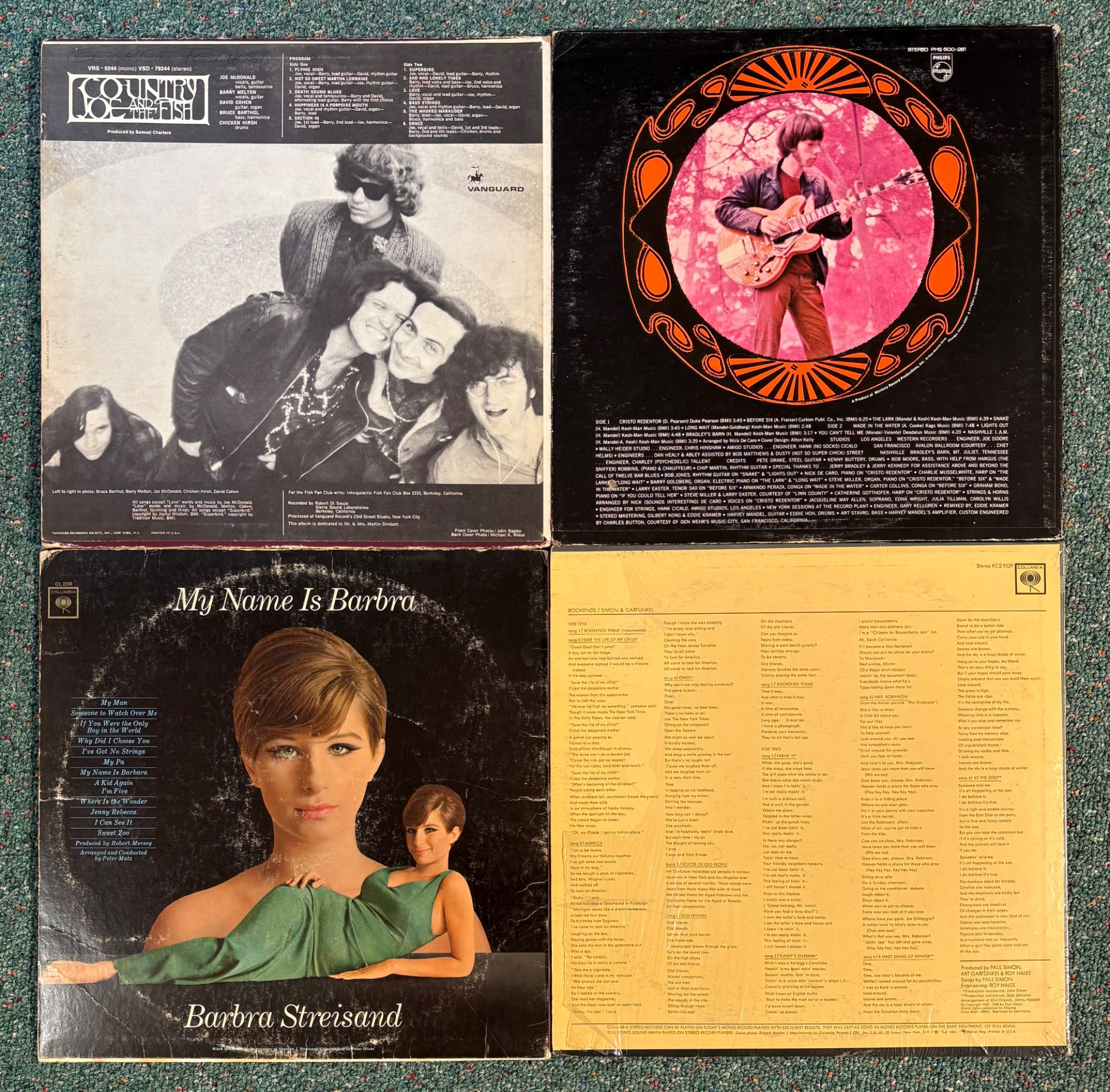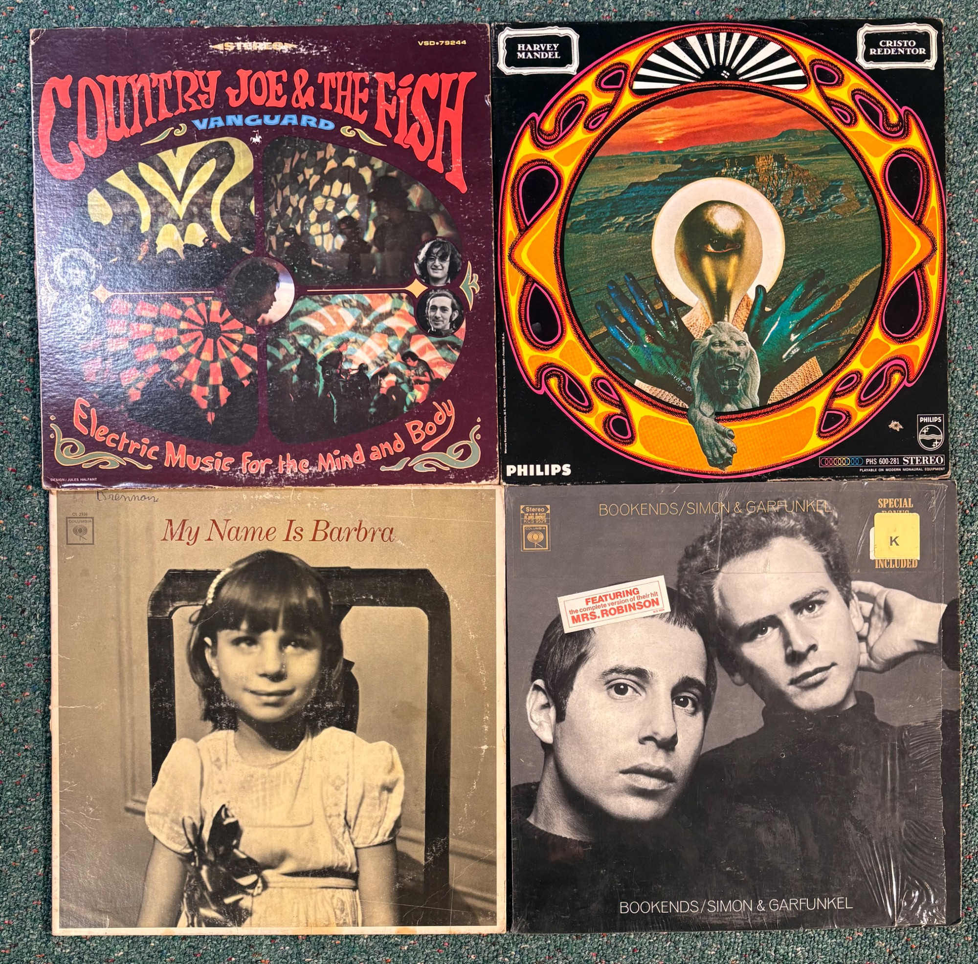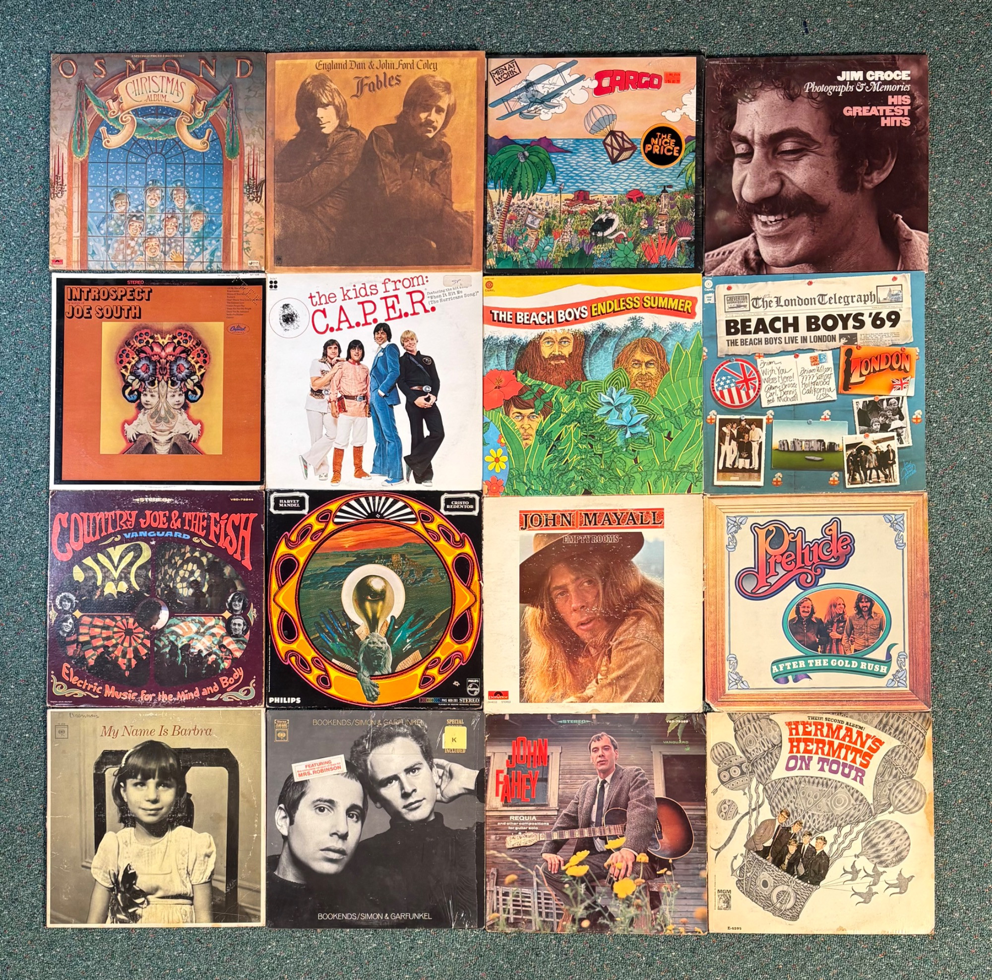 16 vintage vinyl LPs! Our client had eclectic taste and loved his albums - thus, most of these have been lovingly played over the years. We checked to make sure the correct album was in the correct cover and did a cursory glance for any egregious scratches. Some covers reflect heavy use and are worn/split in places/have names written on them. However, the majority are in good used shape. Artists/Bands in this lot include: The Beach Boys (2 albums) Prelude Herman’s Hermits John Mayall John Fahey Men At Work Jim Croce The Kids From C.A.P.E.R. Harvey Mandel Osmonds England Dan & John Ford Coley Joe South Barbra Streisand Simon & Garfunkel Country Joe & The Fish Note: Osmonds inner sleeve is missing