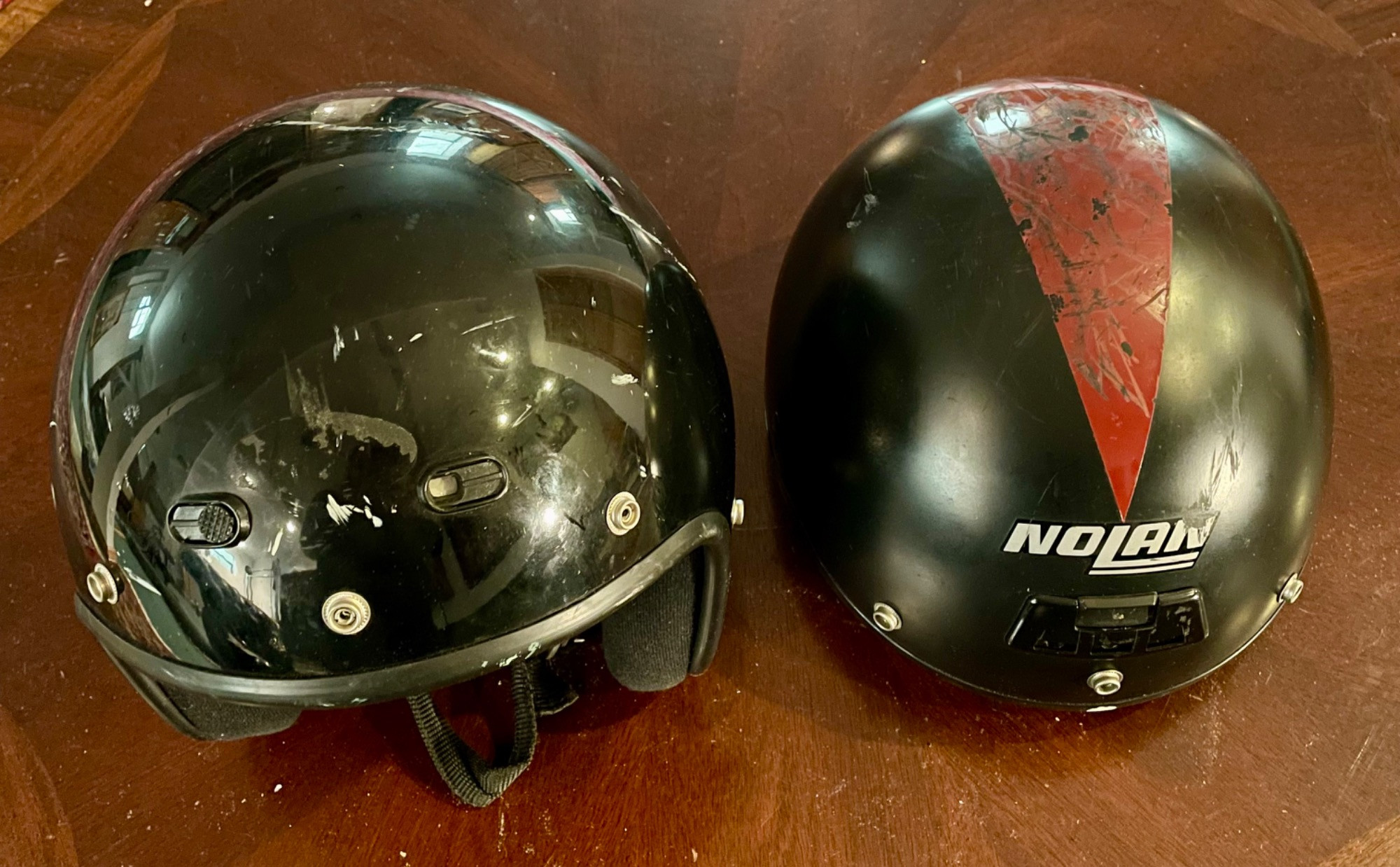 Classic motorcycle helmet pair. Nolan “Cruise” made in Italy; black with red detail. Size M/L (8.5” front to back interior shell and 7” side to side interior shell) Unbranded solid black ABS-formed with polystyrene liner. Size XL (9” front to back interior liner, 8.25” side to side). No face mask; one front vent closure is missing the slider.