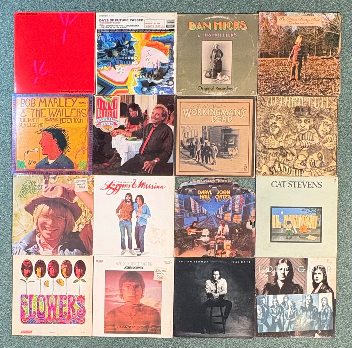 16 vintage vinyl LPs! Our client had eclectic taste and loved his albums - thus, most of these have been lovingly played over the years. We checked to make sure the correct album was in the correct cover and did a cursory glance for any egregious scratches. Some covers reflect heavy use and are worn/split in places/have names written on them. However, the majority are in good used shape. Artists/Bands in this lot include: John Denver (2 albums) Flowers Loggins & Messina Hall & Oates Julian Lennon Cat Stevens Dan Hicks & His Hot Licks Foreigner Grateful Dead The Allman Brothers Band Jimmy Buffett Moody Blues Bob Marley & The Wailers Jethro Tull Uncle Bonsai Note: Flowers inner sleeve is missing. Hall & Oates album cover is REALLY BAD - it has been torn away.