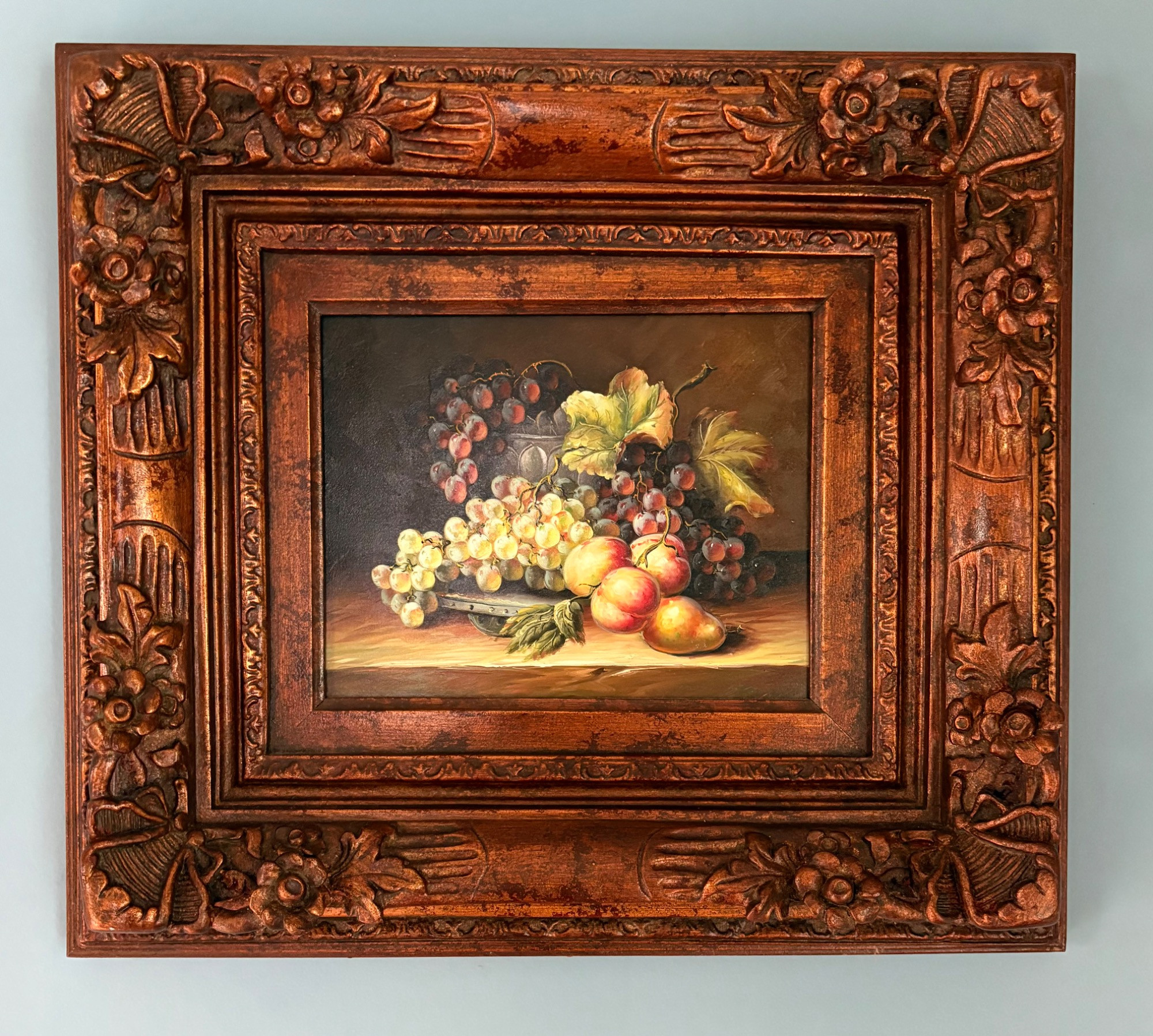 Original oil painting - still life image of fruit (peaches and grapes) on wood panel. Artist unknown. Framed in a detailed relief carved wood frame. Smaller piece at about 1.5' square. From Around the Corner Fine Art of Virginia known for producing high quality reproductions & frames in the 1980s & 1990s (Sadly, they appear to have closed shop in the early 2000s). We found a catalogue offering many of the exact works our client owned that roughly aligns with our client's purchase dates (pre-internet when everything was phone ordered or mail ordered). For those curious about the original price range/production of the paintings, see catalogue info in photos below after the listing photos. Can be shipped FedEx.