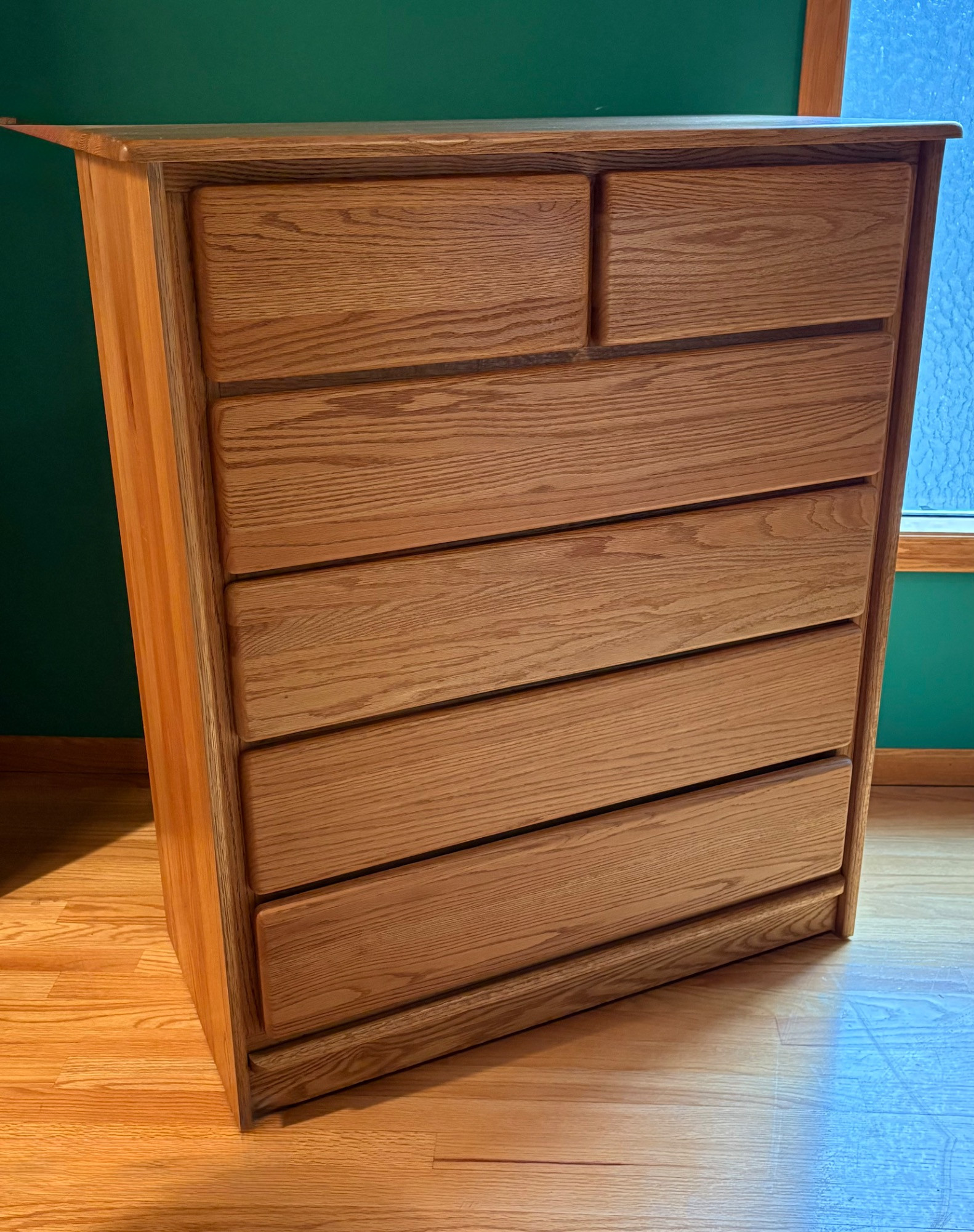 Wooden tall chest of drawers with curved drawer edges and cut-out finger channel at bottom of drawers. Four large drawers on the bottom with two smaller ones at the top. In perfect condition - including the top surface - with the exception of one small scratch on the right hand side - see last photo for details. Purchased at long-time local furniture store Don Willis Furniture (now closed, alas!). Made in USA. Marching chests of drawers in Lots #27 & #199. Local Pickup Only. Bidding on this lot is an agreement that: (1.) You will have 2 capable, able-bodied persons to lift and load at a minimum. (2.) You will bring a hand truck and/or any other tools needed to remove this item. If these steps are not followed your item will be forfeited and no refund given.