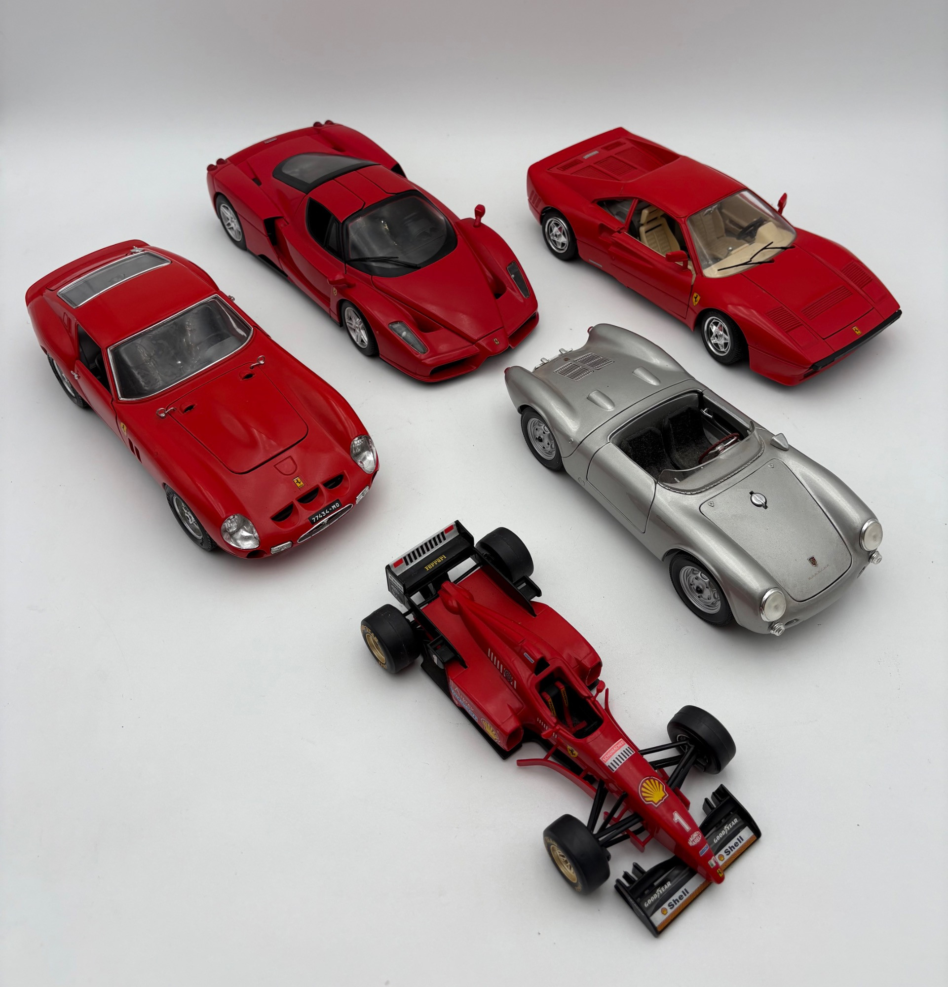Six quality model cars from various makers. Largest measures 10" L. Smallest measures 7" L. Burago Ferrari GTO - 1/18 scale - made in Italy Hot Wheels Enzo Ferrari - made in China Burago Ferrari GTO - made in Italy Maisto Porsche 55A Spyder - scale 1/18 - made in Thailand (in silver color) Burago Ferrari F310 - scale 1/24 - made in Italy