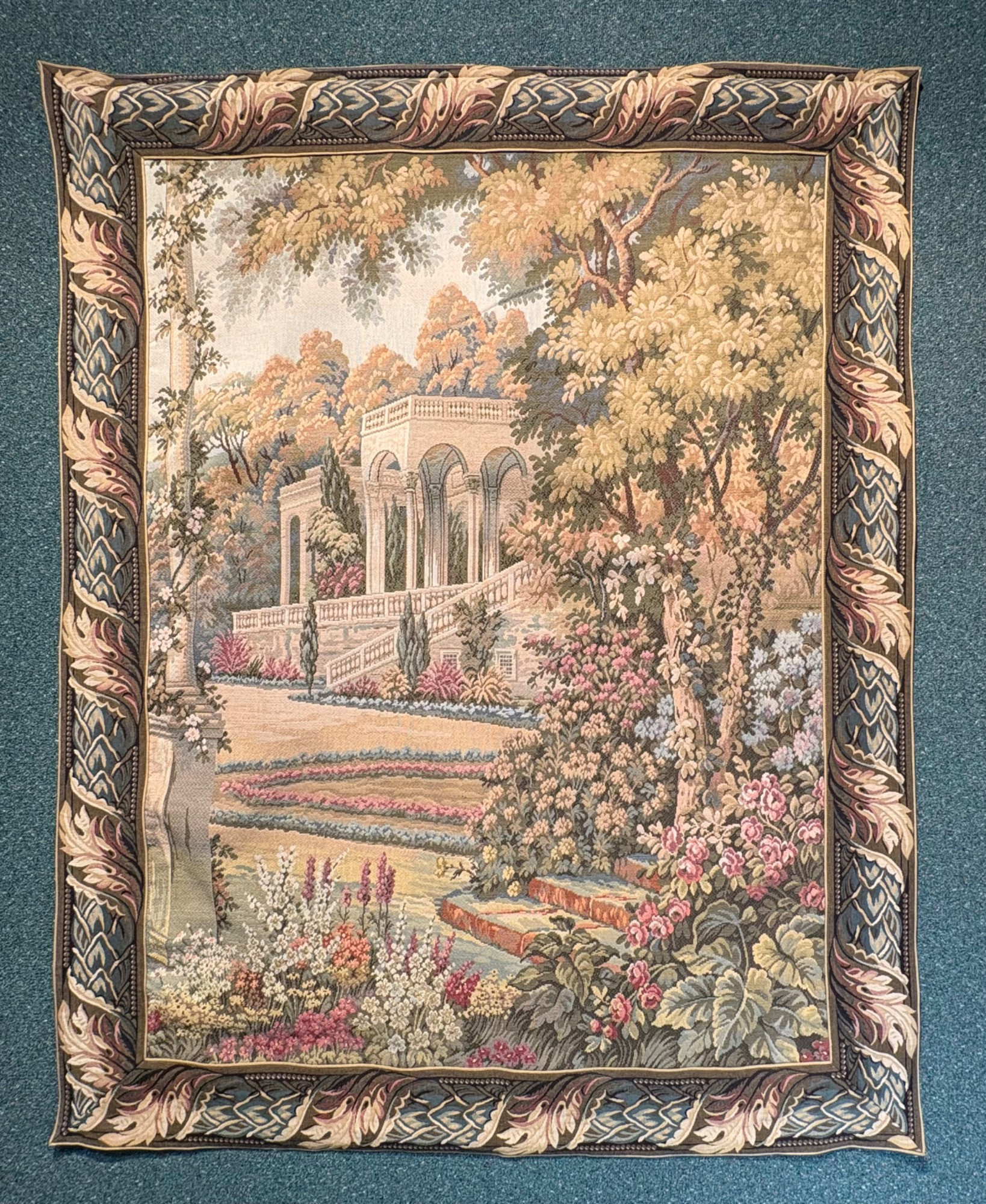Classic Italian garden temple scene. It is quite large - about 5' high by 4' wide. Nice tight weave & fully lined. Made in France. Rod pockets need a quick whipstitch at the very ends. Note: All tapestries listed in this auction are in good condition, but all would benefit from a good wash.
