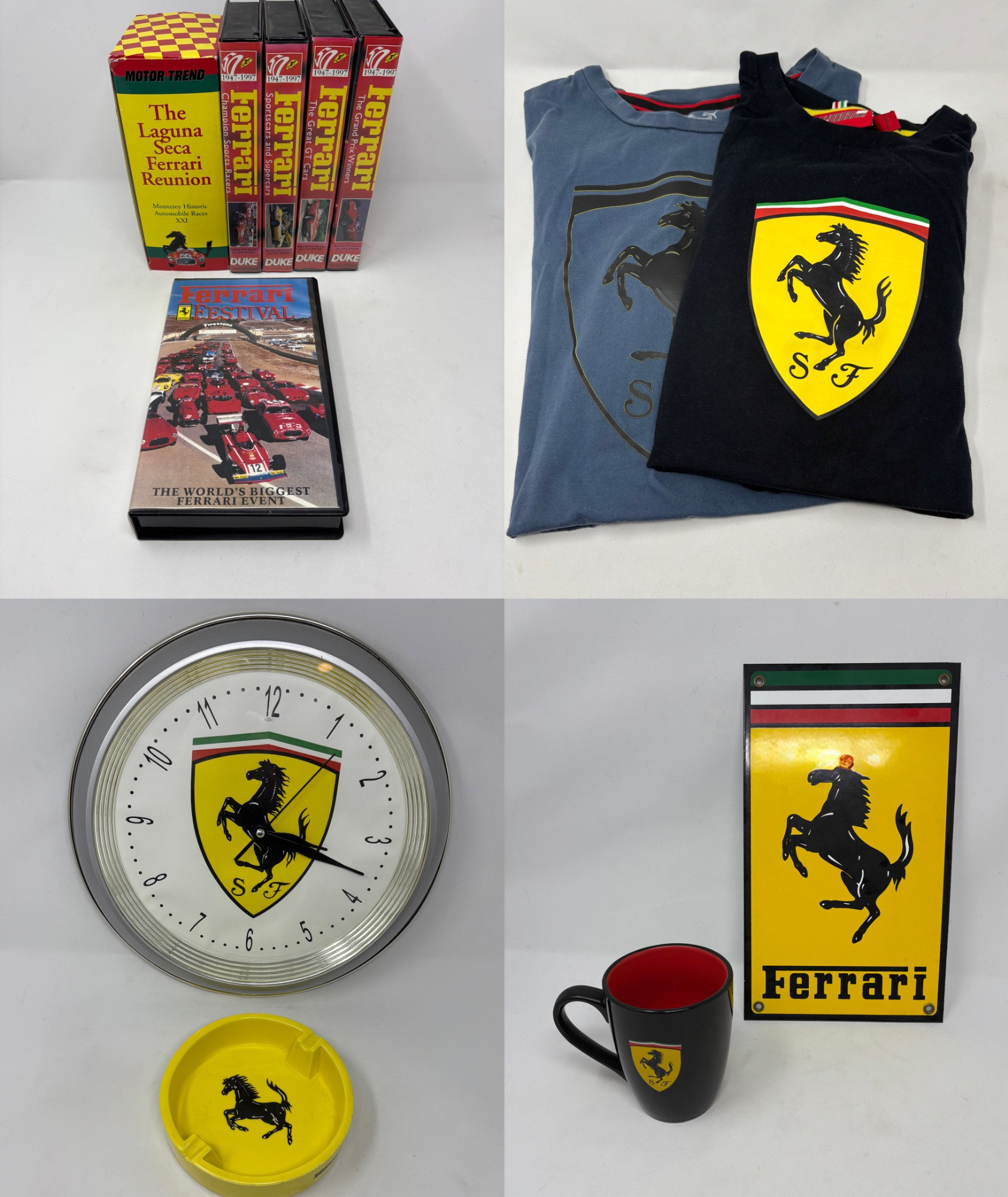 All things Ferrari: 8 vintage Ferrari VHS tapes from various festivals races, etc. Ferrari metal plate sign with emblem. Measures 12" H x 7" W. Small red Ferrari flag. Measures 8.5" H x 11.5" W. Ferrari coffee mug in black with a red interior. Measures 4.5" H. Appears to be new. Pair of Ferrari T-shirts - one in blue & one in black. Both size XXL. Ferrari ceramic ashtray. Measures just over 6" diameter - made in Italy. Ferrari clock - runs on batteries. Measures 13.5" diameter.