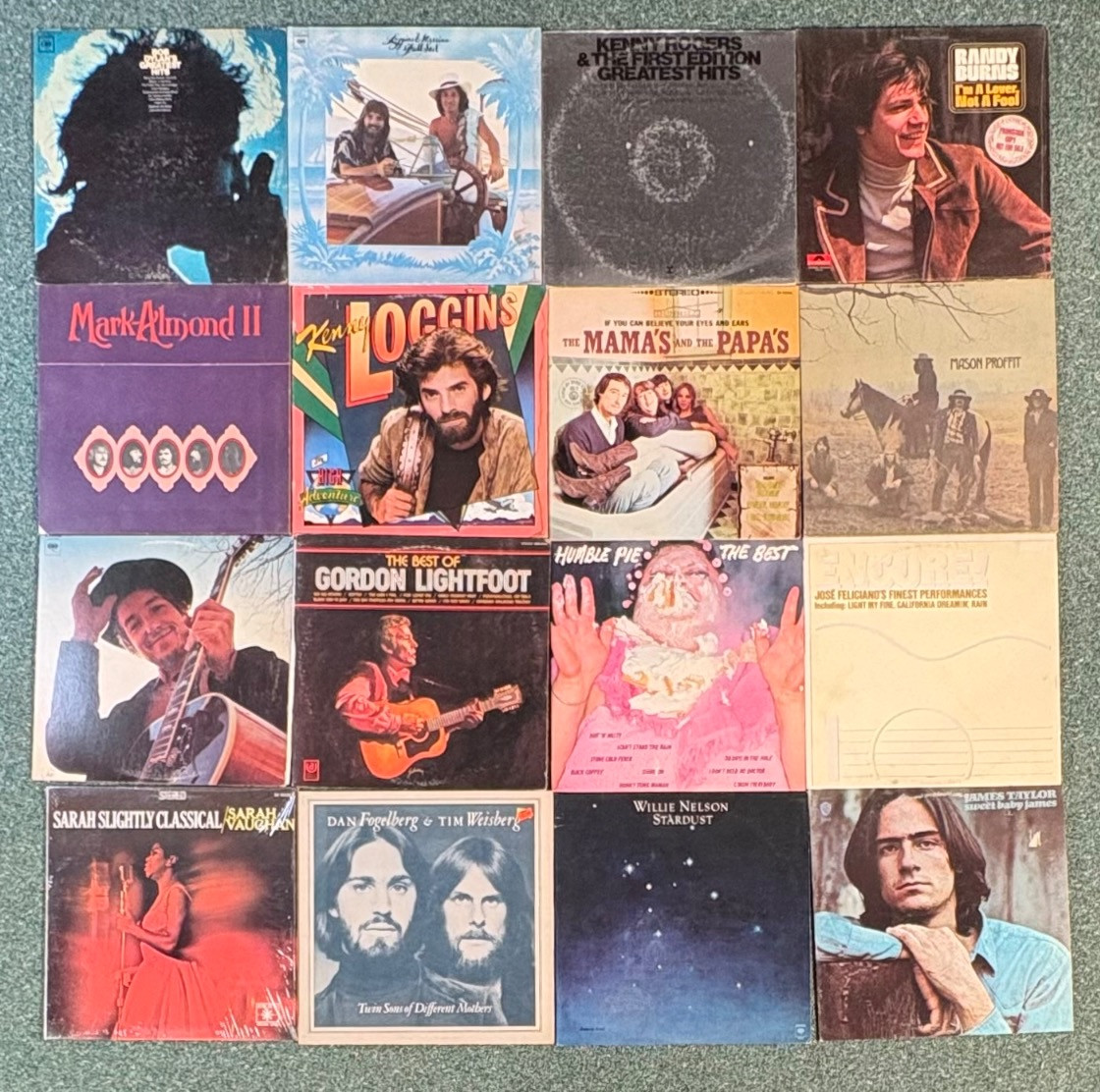 16 vintage vinyl LPs! Our client had eclectic taste and loved his albums - thus, most of these have been lovingly played over the years. We checked to make sure the correct album was in the correct cover and did a cursory glance for any egregious scratches. Some covers reflect heavy use and are worn/split in places/have names written on them. However, the majority are in good used shape. Artists/Bands in this lot include: Bob Dylan (2 albums) Sarah Vaughan Dan Fogelberg & Tim Weisberg Gordon Lightfoot Humble Pie Willie Nelson Jose Feliciano James Taylor Loggins & Messina Kenny Loggins Mark-Almond Kenny Rogers The Mamas & The Papas Mason Proffit Randy Burns Note: Loggins & Messina and one Dylan album missing inner sleeves