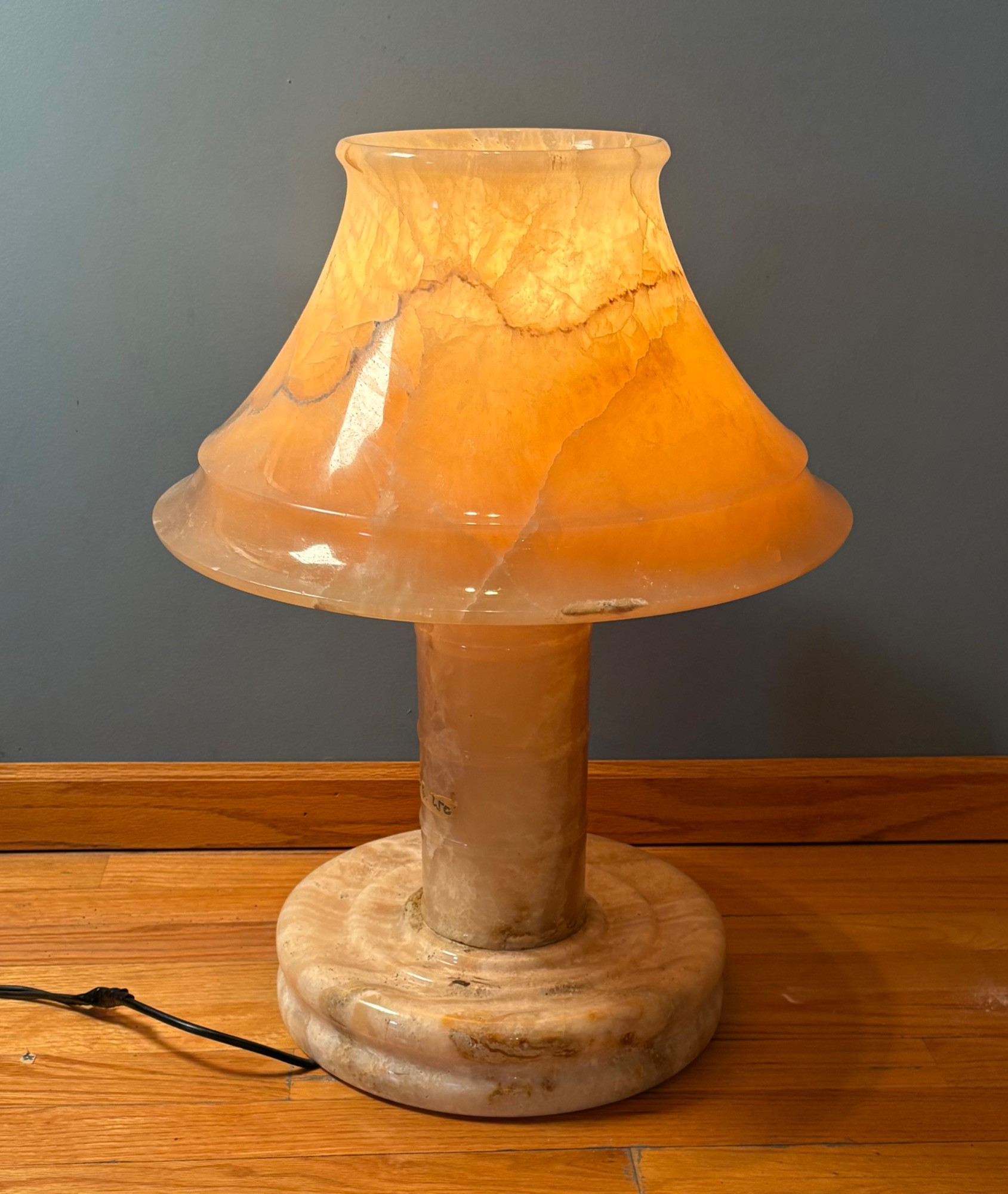 It's a good thing this marble lamp comes apart in 2 pieces or the average person could never lift it up! It is incredibly heavy and thus, extremely stable at the bedside. Beautiful soft glow through the rock with light going up to create a soft mood. Base & shaft measure approx. 15" H. Shade measures just over 15" at its widest by 8" H, so total height is approx. 23". 9' black cord with on/off a switch & double-prong plug. Note: this lamp appears to have been repaired at one time - there is some glue residue where the shaft meets the base and a masking tape label that needs to be removed. The cord is also wrapped with electrical tape in one section. See last 3 photos for details. Note - Matching lamp in Lot #99.