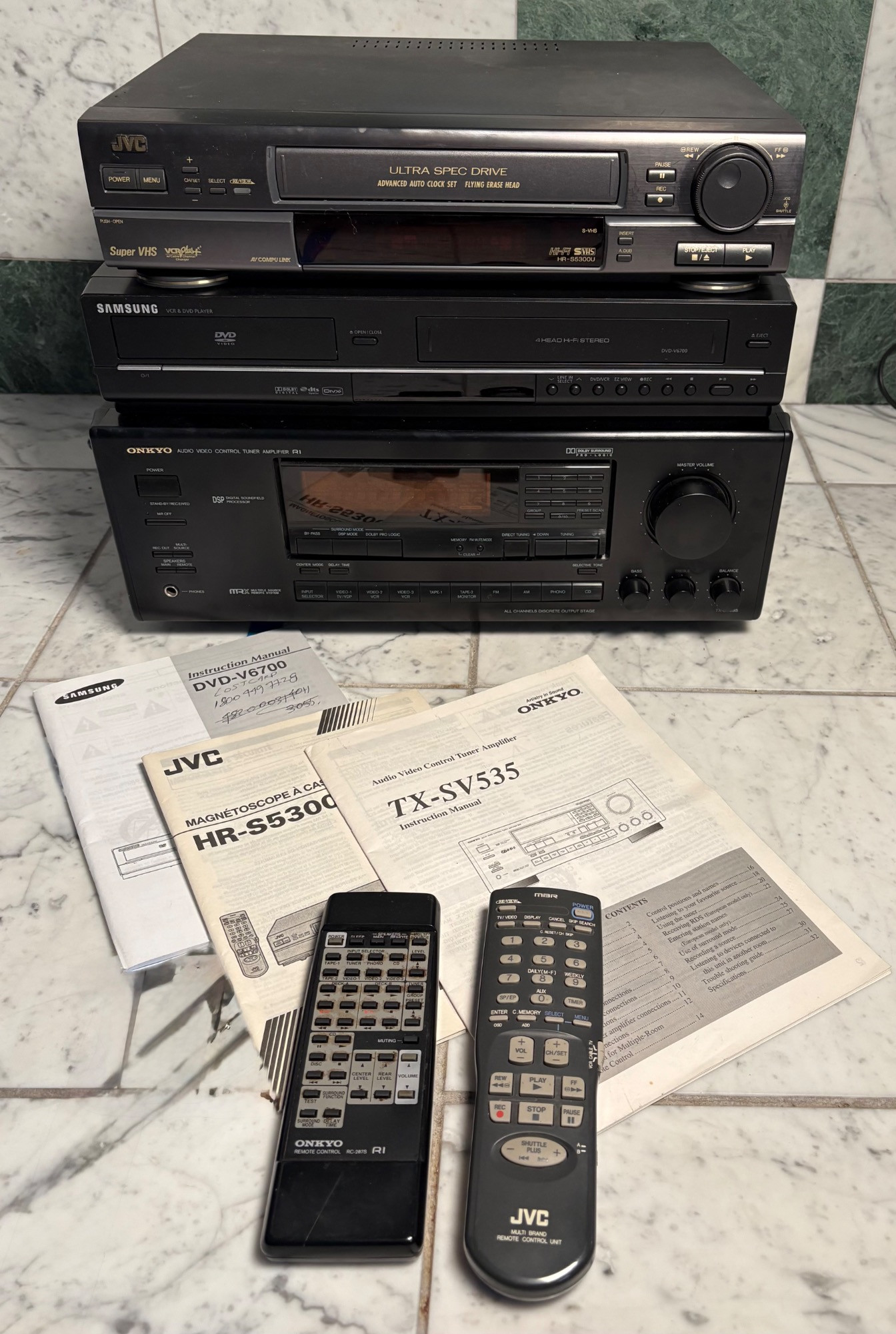 Onkyo Audio Video Control Tuner Amplifier TX-SV535 Dolby Surround Sound Pro Logic Multiple Source Remote System, All Channels Discrete Output Stage. Powers on. JVC HR-S5300U Ultra Spec Drive VCR Player, AV Compu Link. Powers on. . Samsung DVD-V6700 DVD and VCR Player Combo, Dolby Digital DTX DIVX. Powers on.