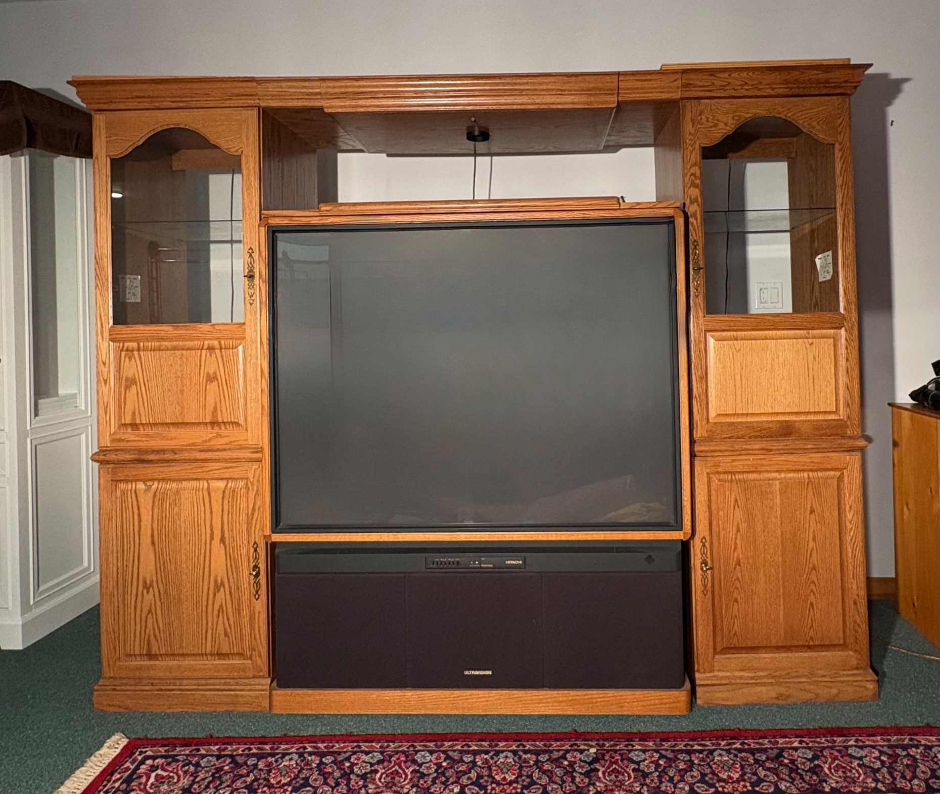 Large Hitachi projection color TV. Wood trim that matches the cabinet on the exterior of the TV. It appears to be on wheels so it can be moved. TV itself measures just shy 61" H x by 52.5" W. Diagonal screen measurement is 60. TV powers on. Surround cabinet appears to be out of honey oak with gold hardware and lighting above the glass sections.. There are two swing doors on either side of the tv and crown molding around the top of the piece. Cabinet measures approx. 78" H x 10" W (widest at the top of the crown molding). We have several backing pieces our client removed but saved from the cabinet should you prefer to move center shelf (now on top of the TV in the photos) to become an actual shelf or to hold a smaller tv. We've included a remote we think goes with this TV and the owner manual. Note that there is also a center recessed light, but we didn't have the right bulb to test it. Cabinet need to be taken apart to get out the basement door, but there are no steps involved and loading area is directly outside the basement door. . Local Pickup Only. Bidding on this lot is an agreement that: (1.) You will have 2 capable, able-bodied persons to lift and load at a minimum. (2.) You will bring a hand truck and/or any other tools needed to remove this item. If these steps are not followed your item will be forfeited and no refund given.