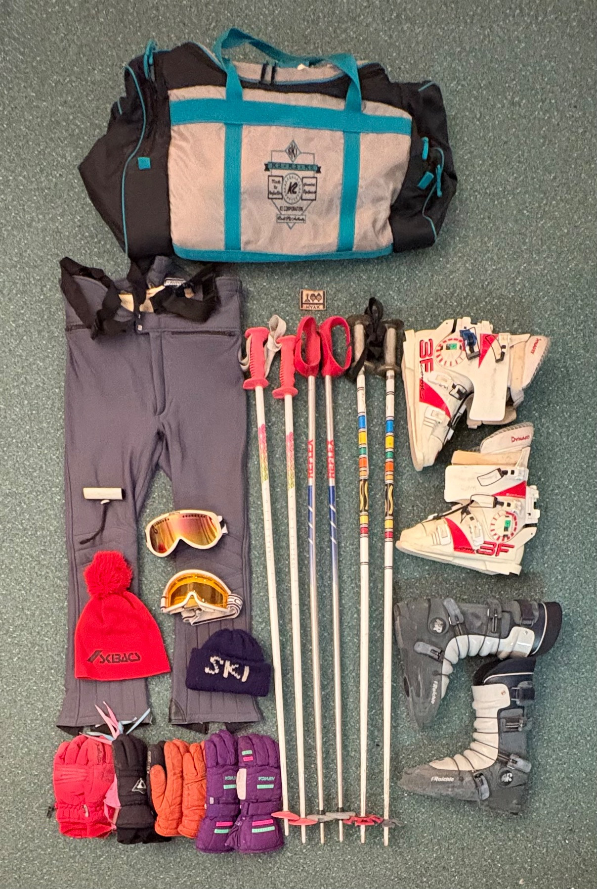 Large group of ski accessories. Lot includes: Raichle Swiss ski boots - size10. Dynafit Austrian ski boots - size not found, but probably a 10 given client's shoe size. 2 vintage ski hats with the blue one needing a good sweater shave. 2 vintage pairs of Smith and Scott goggles - both need a good wash and some foam replacement. 3 pairs of ski poles - brands include K2, Reflex, and Scott. The Reflex pair appears to be slightly bowed. We’re not skiers so we don’t know if that disqualifies from use - please see photo 1 pair of men’s Skitique underlayer overalls of cotton and nylon with soft terry-cloth interior - size 36. 1 old-fashioned ski carrier cinch. 3 pairs of vintage gloves - the orange ones are leather. Good-size K2 ski duffle bag (all items in lot except poles fit and there's still lots of room) BONUS: 2 vintage VCR tapes not in lead photo.