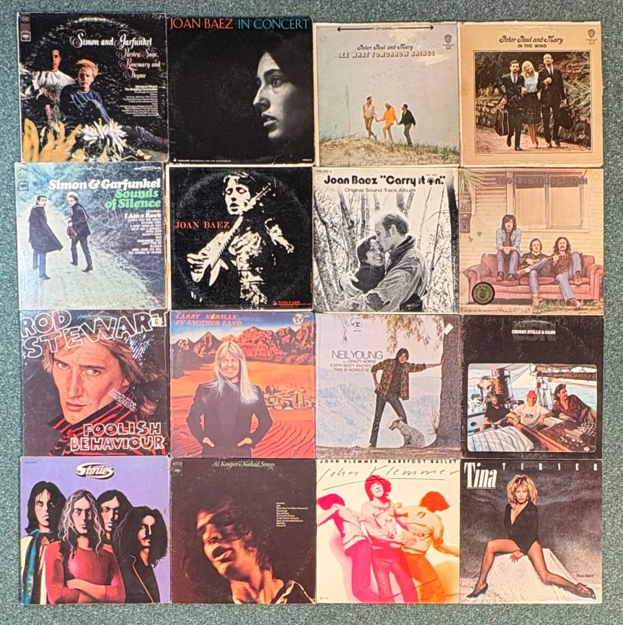 16 vintage vinyl LPs! Our client had eclectic taste and loved his albums - thus, most of these have been lovingly played over the years. We checked to make sure the correct album was in the correct cover and did a cursory glance for any egregious scratches. Some covers reflect heavy use and are worn/split in places/have names written on them. However, the majority are in good used shape. Artists/Bands in this lot include: Rod Stewart Stories Larry Norman Al Kooper Neil Young John Klemmer Crosby Stills & Nash (2 albums) Tina Turner Peter, Paul & Mary (2 albums) Simon & Garfunkel (2 albums) Joan Baez (3 albums)