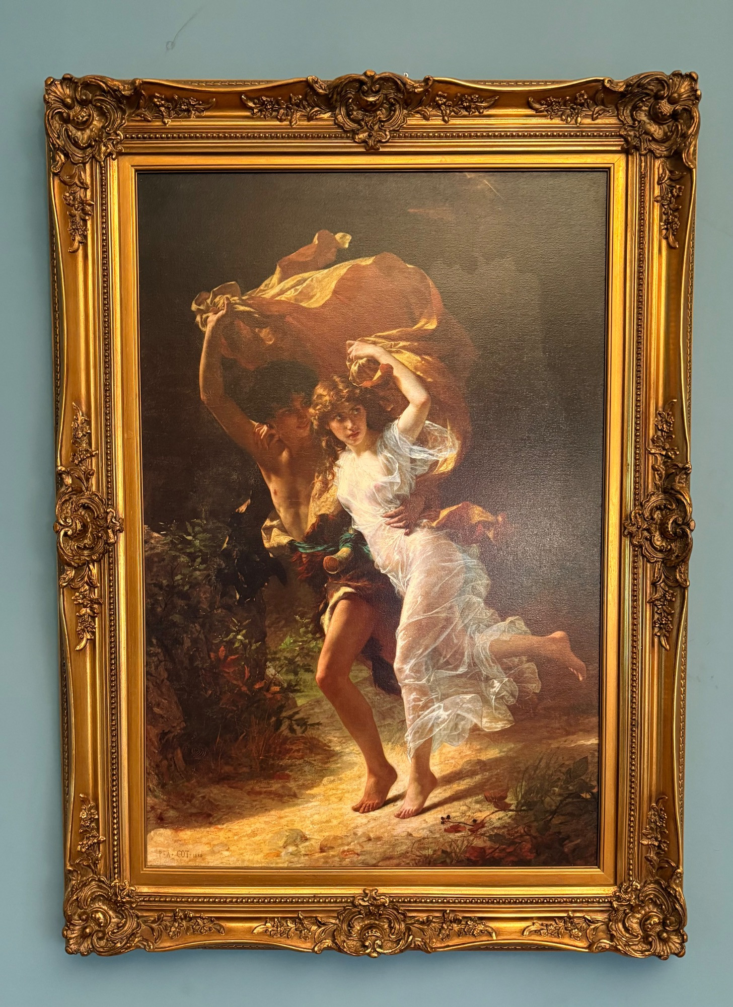 “The Storm” by Pierre Auguste Cot (1837 - 1883). Reproduction painting on canvas with typical classical imagery and high contrasts lighting. Surrounded by a lovely carved wood frame in gold. Medium or larger size work at just under 4' high by 3' wide framed. From Around the Corner Fine Art of Virginia known for producing high quality reproductions & frames in the 1980s & 1990s (Sadly, they appear to have closed shop in the early 2000s). We found a catalogue offering many of the exact works our client owned that roughly aligns with our client's purchase dates (pre-internet when everything was phone ordered or mail ordered). For those curious about the original price range/production of the paintings, see catalogue info in photos below after the listing photos.