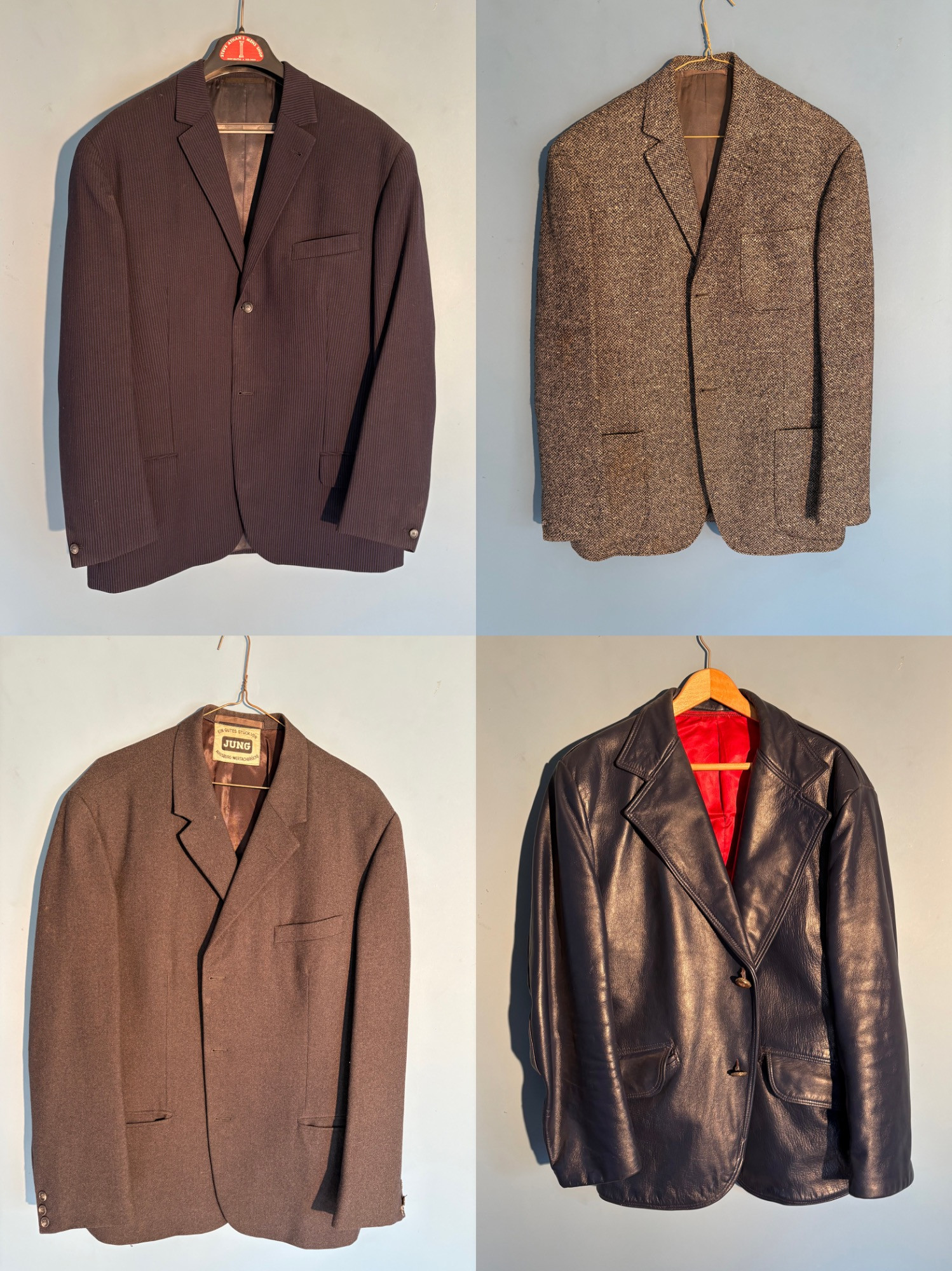 Vintage sport jacket quartet. The first 3 jackets in this lot were made in Europe and are vintage. We could not find sizes on them, but are guessing they are somewhere around a 44 or 46 long given the client's other suits. They all appear to be wool and there are a few moth holes in the striped jacket - see last 2 photos - and some flaw here and there. However we believe all three were beautiful pieces of workmanship in their day and a vintage enthusiast would love them and find the small repairs worth doing. Vintage navy blue leather sport coat-style jacket. Has two-button front closure and is lined in red. No traditional makers tag but embossed in the leather on the inside pocket is "Azure by Lin - 1978". This leads us to think that it was custom made for our client and his other jackets were 44 or 46 long and/or XL. Note that the lining is a little worse for wear - see last photo - but the exterior leather appears to be in great shape. It would be worth getting the jacket relined if you like it as the leather is heavy-duty. and in great condition. Bonus - additional blue wool sport jacket not pictured; has breast pocket removed.