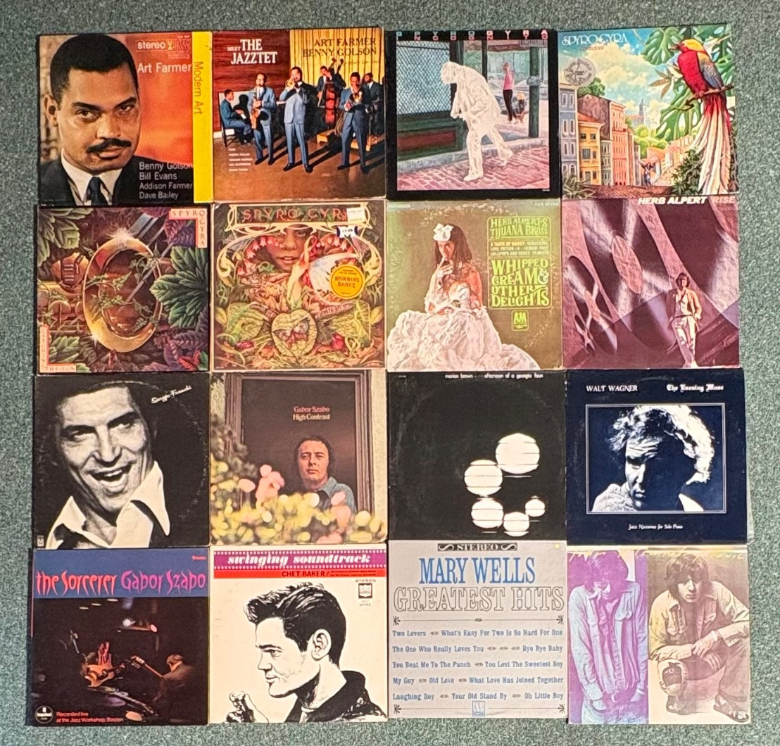 16 vintage vinyl LPs! Our client had eclectic taste and loved his albums - thus, most of these have been lovingly played over the years. We checked to make sure the correct album was in the correct cover and did a cursory glance for any egregious scratches. Some covers reflect heavy use and are worn/split in places/have names written on them. However, the majority are in good used shape. Artists/Bands in this lot include: Gabor Szabo (2 albums) Marion Brown Mary Wells Walt Wagner John Klemmer Chet Baker Sergio Franchi Spyro Gyra (4 albums) Herb Alpert (2 albums) Art Farmer (2 albums)