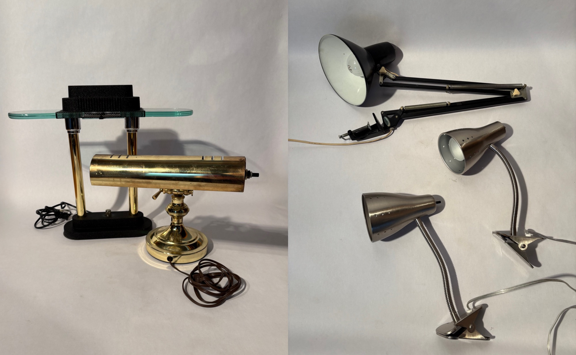 5 contemporary-style table/portable lamps. All are working. - Black & gold halogen column lamp with dimmer dial. - Gold traditional desk lamp with adjustable swivel. - Black screw-on adjustable table-edge work lamp. - 2 silver perforated MCM-style clip-on lights. For size comparison, the halogen light measures approx. 16" H.
