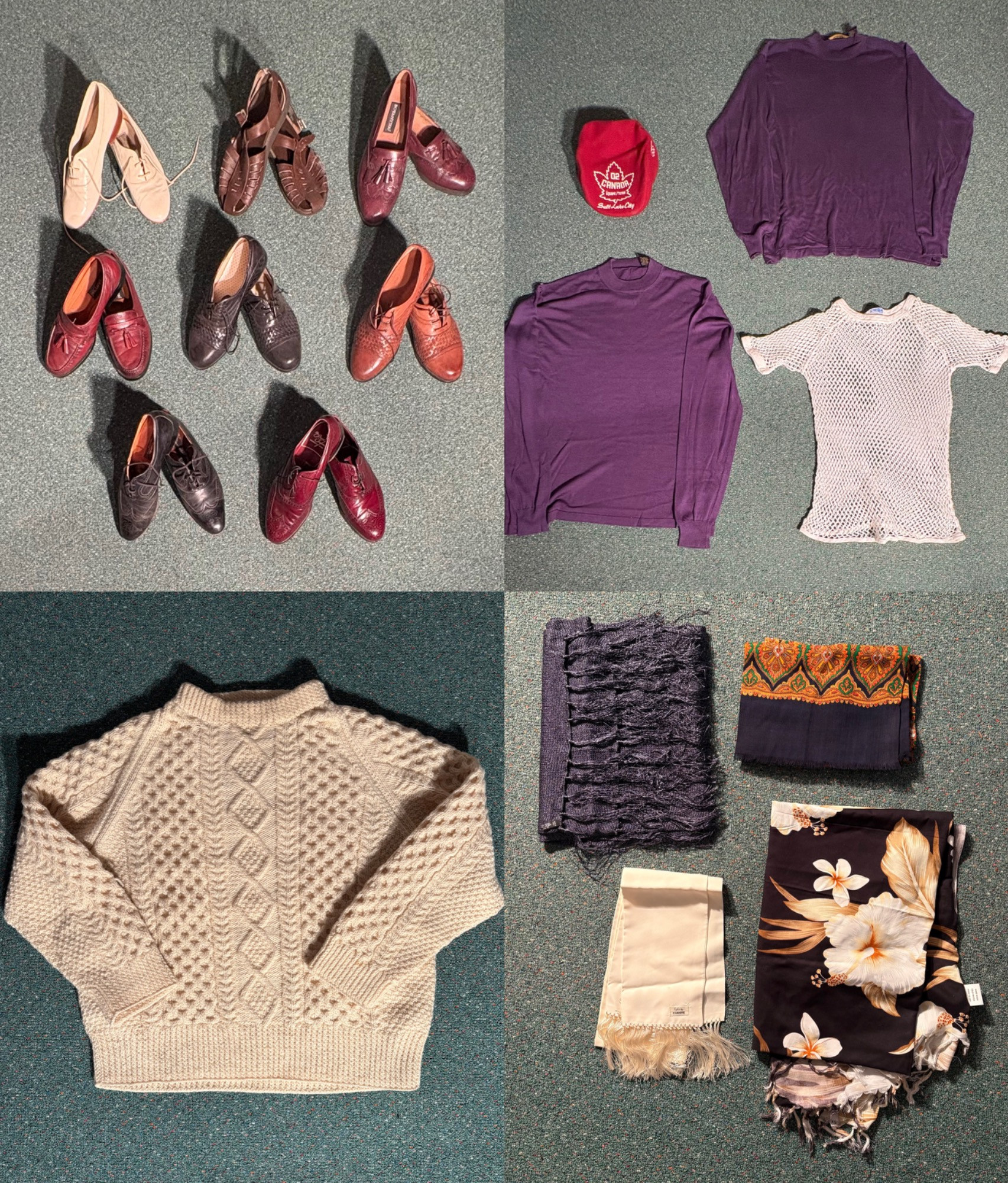 Eight pairs of shoes: 1 pair of Royal Imperial fForsheim wingtips - size 10.5 E 4 pairs of Botany 500 loafers - all size 10.5 W 2 pairs of "novelty" shoes (white & sandals) of much lesser quality - not in great shape - maybe great for a New Wave or Hippie costume. Clothing; 2 purple Bachrach 100% silk lightweight sweaters. Size XL 1 "muscle man" stretchy fishnet net top from Nordic Net (very vintage but in good shape) 1 red wool Roots brand newsboy hat celebrating the 2002 Salt Lake City Olympics. These were super popular and hard to get at the time. In good shape - size XL. Two purple Bachrach 100% silk lightweight sweaters. Size XL. 1 Irish fisherman's sweater from Cannava, Ireland. 100% hand-knitted wool. Needs a good wash as there is some dirt/soiling around the collar and on one cuff. 4 scarves of differing fabrics, design, and size We think our client wore some of these while on his Harley!