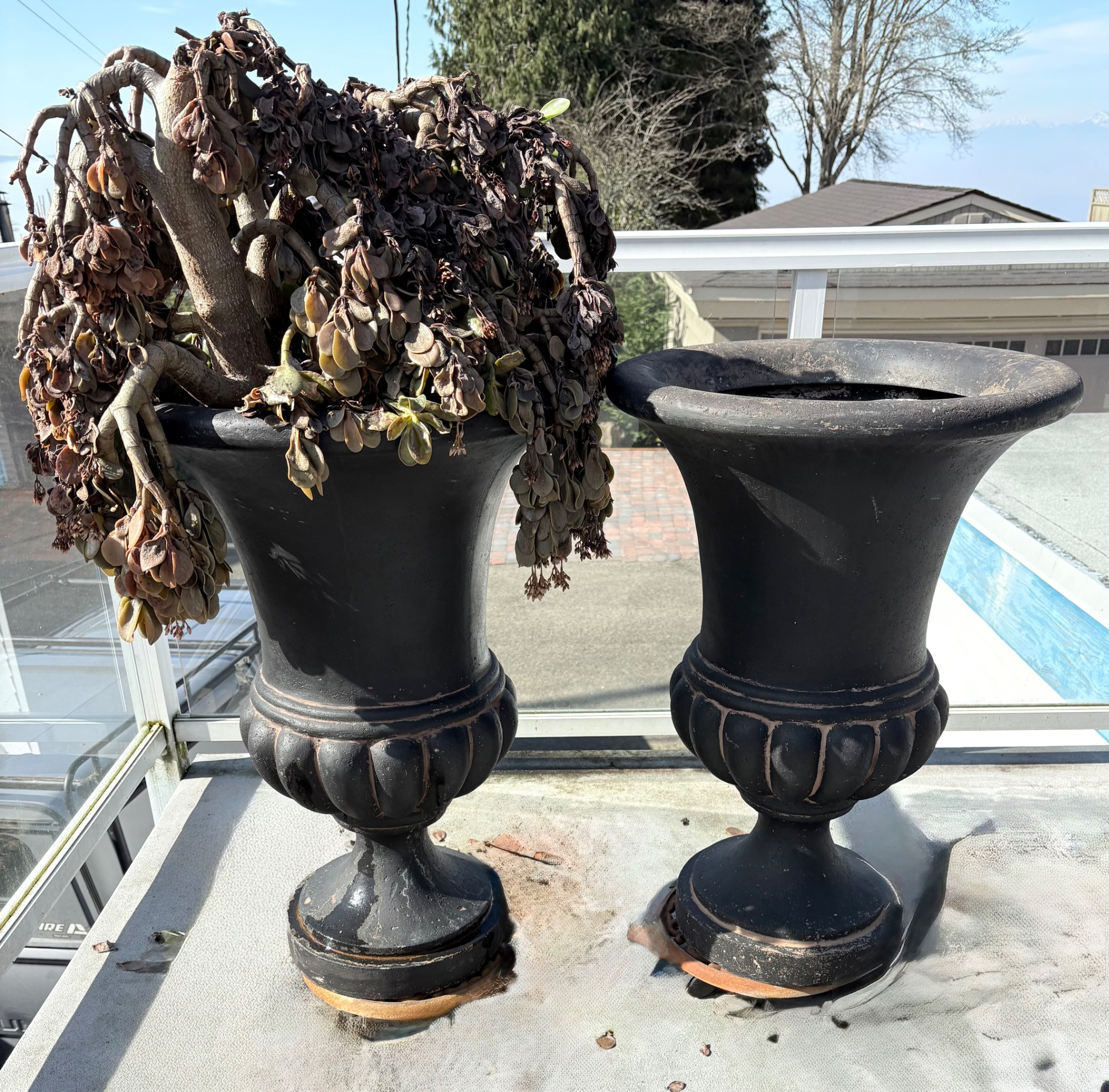 Pair of PEBA Caststone patio planters that look like aged painted concrete, but are actually light enough to lift with one hand when empty.* The urn-shaped planters are identical in black and each comes with a wheeled roller plate. They measure 31.5" H x 20" W at the top. One has an "eveready" jade plant that despite being outside all winter in the terrible cold is sprouting anew - see photos with green foliage.. Note that these planters are made to hold potted plants - if you want drain holes, you will need to drill them. Bonus - if you want another "eveready" jade plant, you may also take the items pictured in the 4th to last photo. The smaller pot has roller plate with a jade plant coming back. (The jade plant on the metal stand to the left has no drain holes & the plant is swimming in water; don't know if that one will come back under these conditions). The metal stand measures 28" H. *a proprietary combination of resign, cement, and crushed limestone over a fiberglass body.