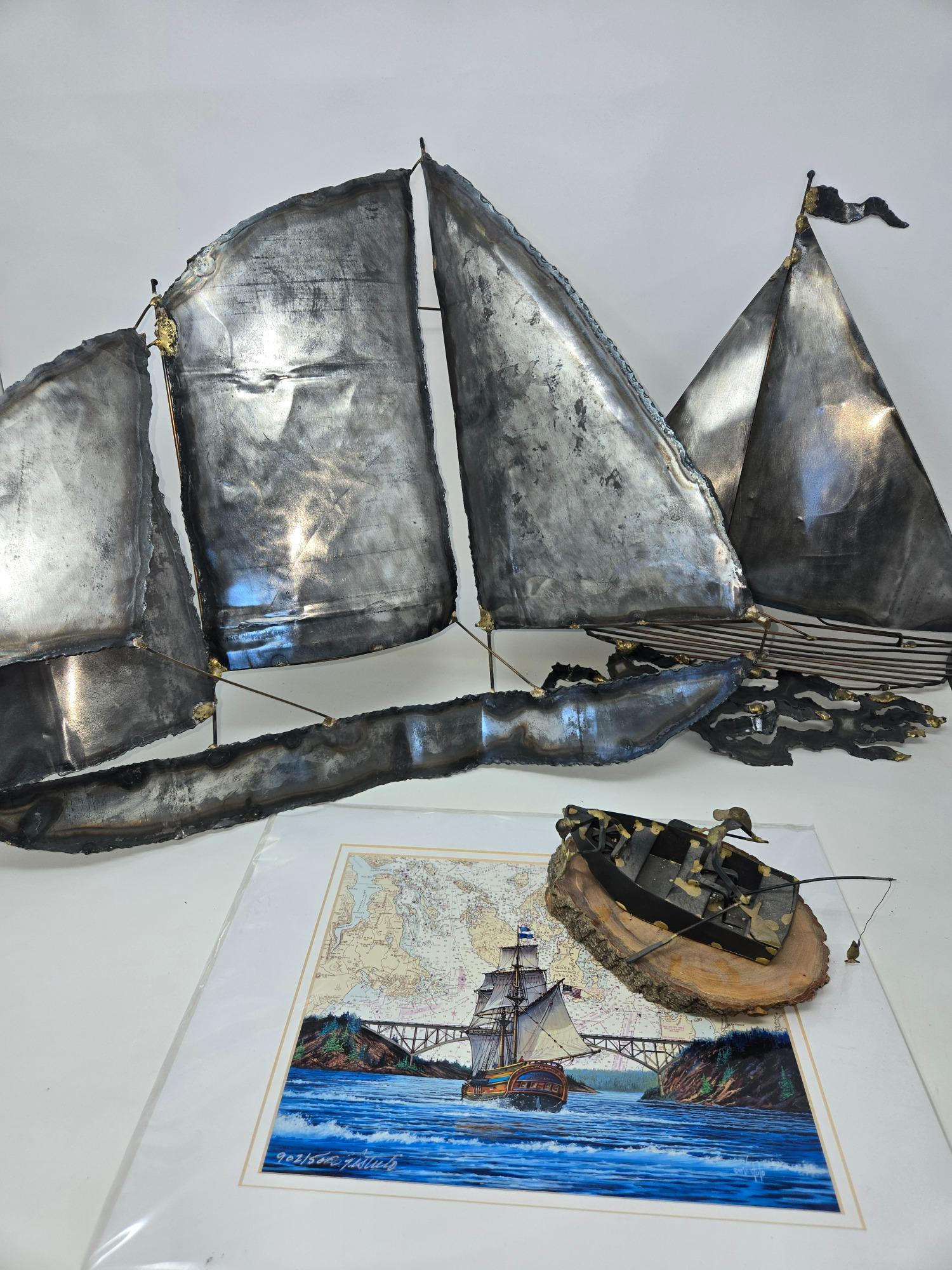 This auction features two unique nautical-themed decorative pieces: Mid-Century Modern Metal Sailboat Sculpture Material: Crafted from hammered steel sheets with brass welding and a varnished finish. Design: Features a stylized sailboat with large, wind-blown sails. Style: Mid-century modern, likely from the 1950s or 1960s. Mounting: Wall-mounted bas-relief, designed to be displayed like a painting. Size: Approx. 24” H x 25” W. Origin: Possibly crafted in the United States. Condition: Displays signs of age and patina, enhancing its vintage charm. Purpose: Ideal for nautical or mid-century décor. “Brothers of the Sea” – Limited Edition Print by Michael Gentry Medium: Likely a lithograph or giclée print. Edition: Numbered 902/500, indicating a limited edition collectible. Artist: Signed by Michael Gentry, adding to its value. Subject: A sailing ship near a rocky, forested coastline. Style: Nautical-themed seascape. Condition: Well-preserved, suitable for collectors or décor enthusiasts. Both pieces offer a timeless nautical aesthetic, perfect for collectors or interior décor enthusiasts.