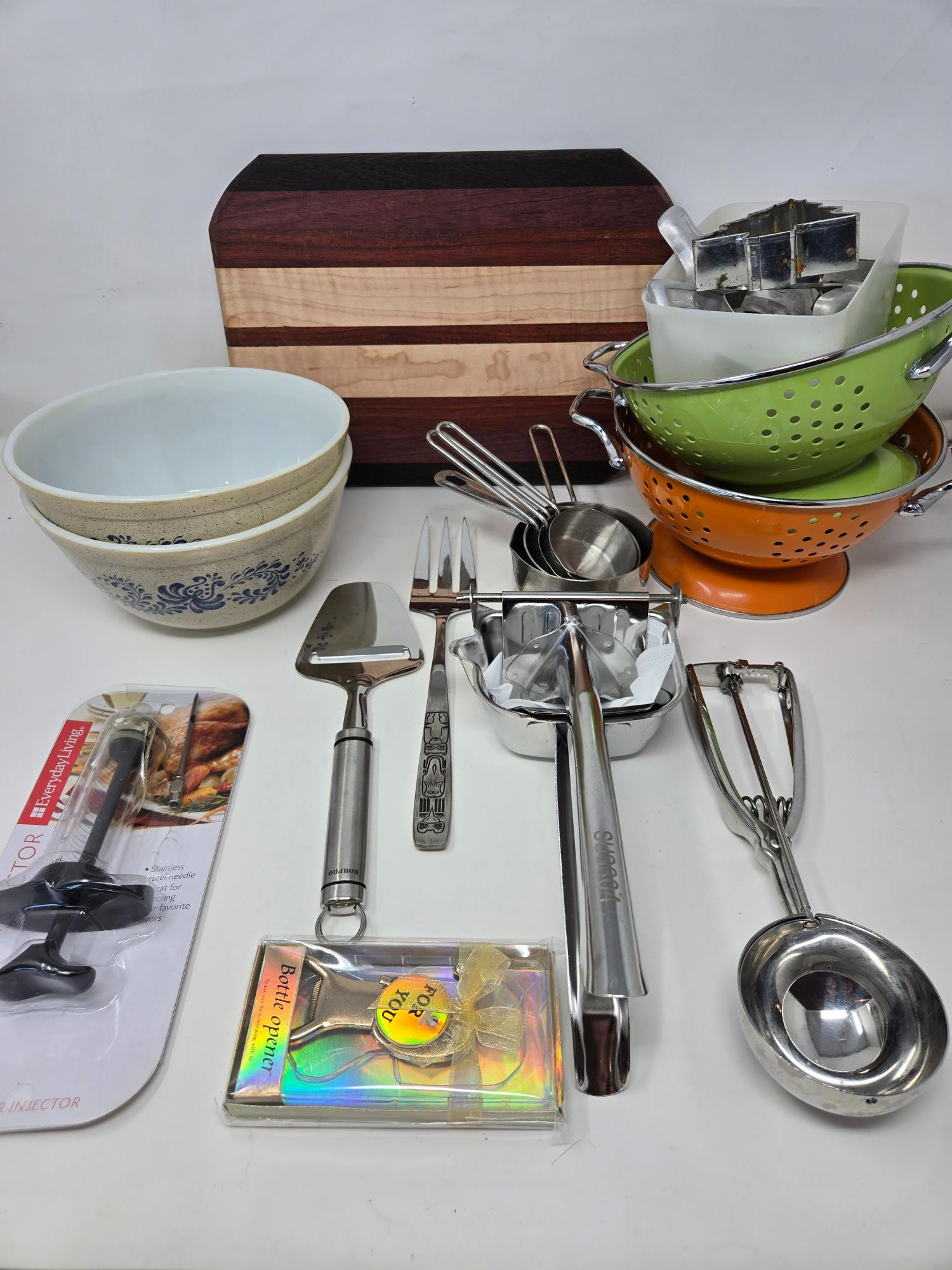 A versatile kitchenware bundle featuring a mix of vintage and modern essentials! This lot includes a variety of cooking and baking tools, perfect for collectors or home chefs. Highlights include: Pyrex Mixing Bowl – Classic vintage glass bowl, marked "Pyrex 402" on the base. Colorful Metal Colanders – One green and one orange, both with handles. Wooden Cutting Board – Handmade striped wood cutting board with a rich, natural grain. Measuring Cups & Spoons – Stainless steel measuring tools for precision cooking. Baking Tools – Cookie cutters in festive shapes, an ice cream scoop, and a cheese slicer. Flavor Injector – Brand new in packaging, perfect for enhancing meats and roasts. Decorative Gift Bottle Opener – New in box, makes a great gift or keepsake.